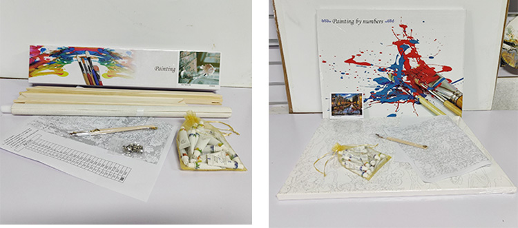 1. Canvas 2. Three brushes (one large, one small, one medium) 3. Acrylic paint 4. Prepared picture frame 5. Box bag packaging