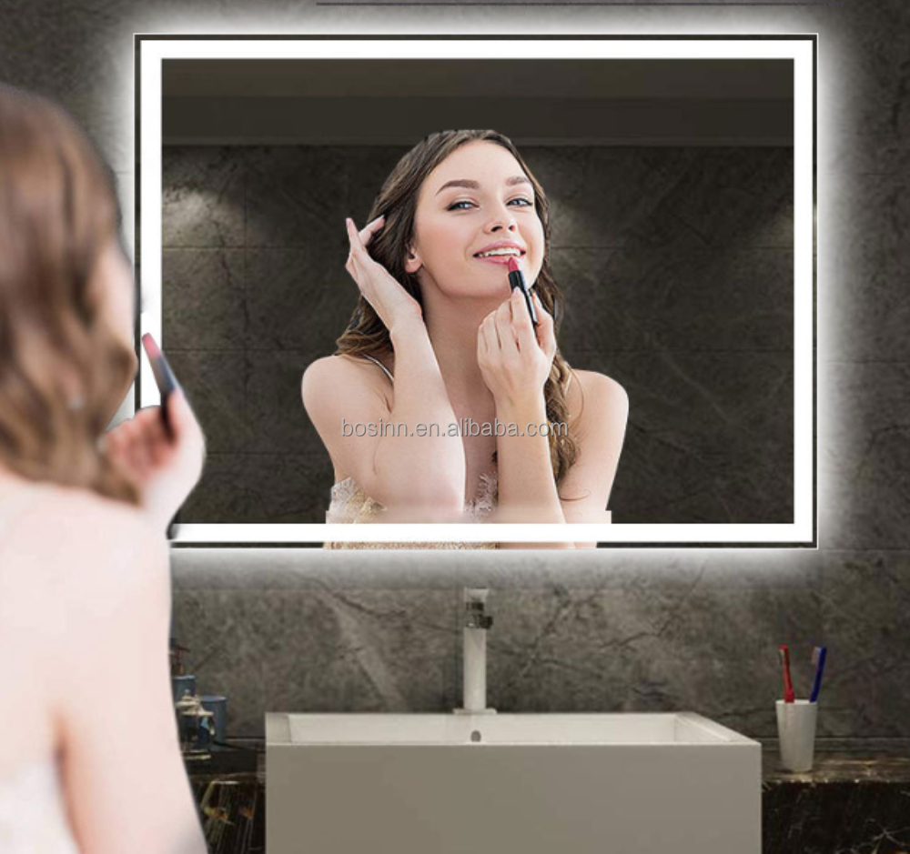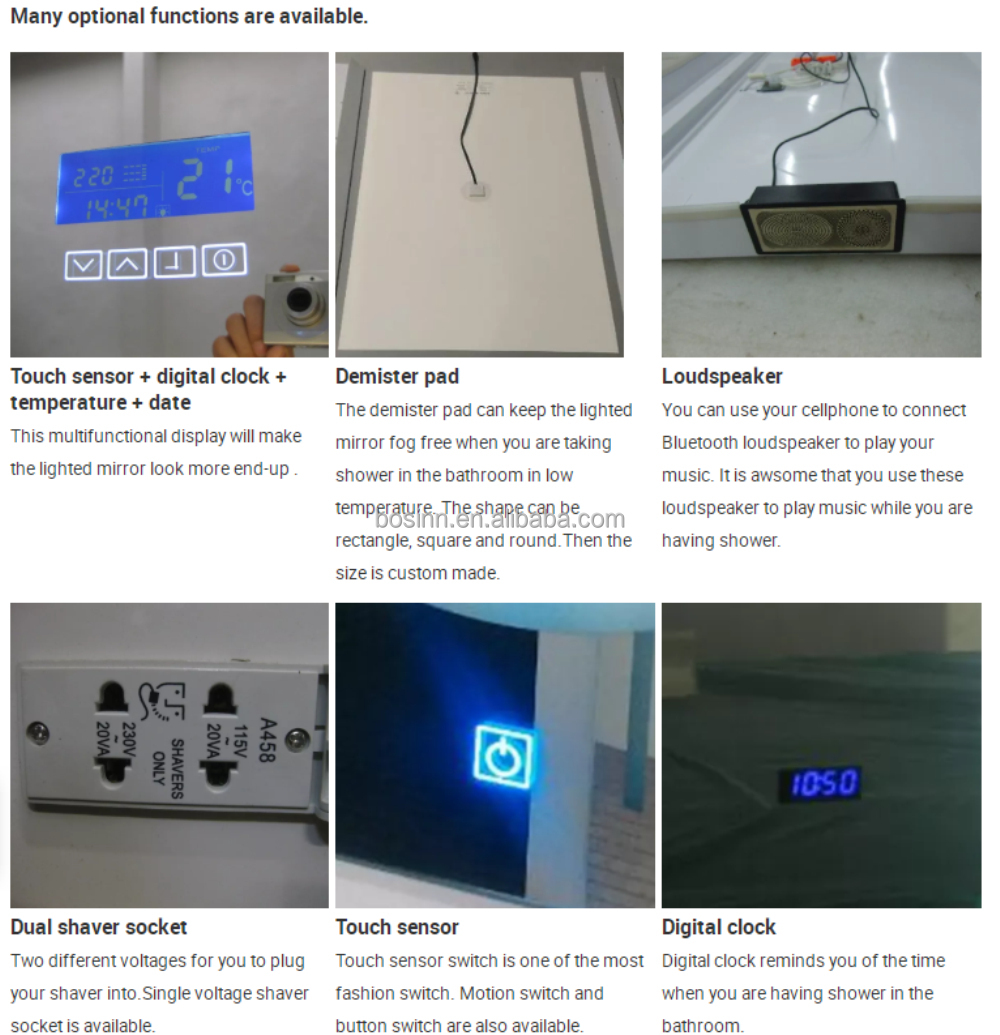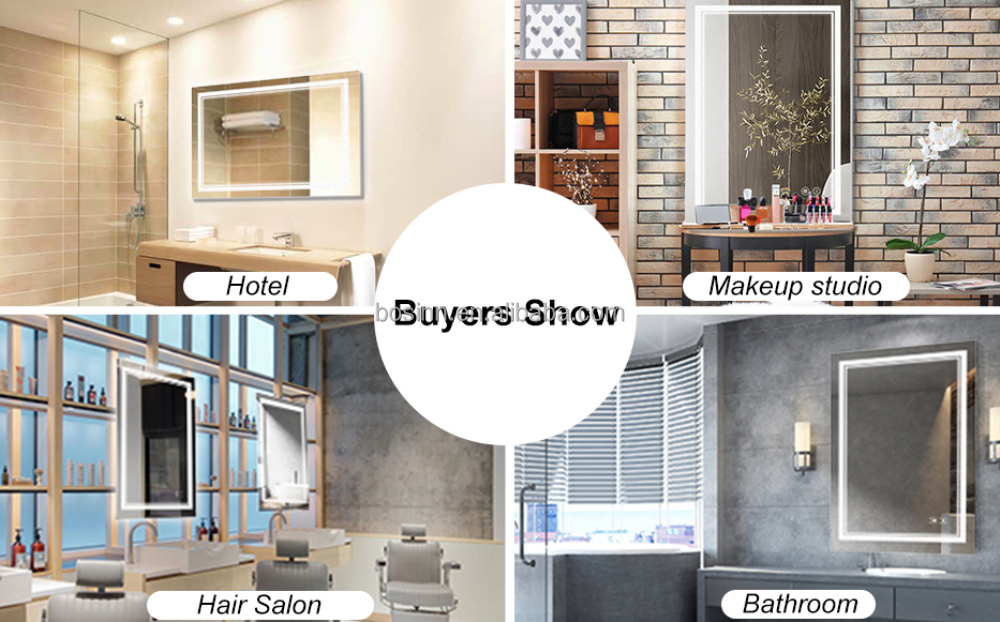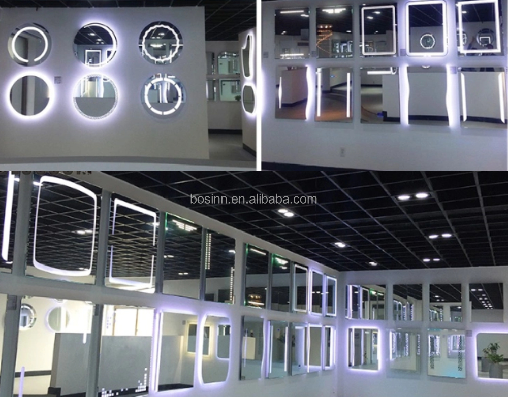 Product material: 5mm environmentally friendly copper-free silver mirror 5mm thick third-generation environmentally friendly silver mirror, automotive-grade float glass, copper-free and lead-free, anti-corrosion, no fingerprints. Product size: 66*66, 88*88, 120*120 or customized size Shape: Rectangular, Square, Round, Irregular, Customized Input voltage (V): AC85~277V (50/60Hz) Power: 8-50W Color temperature: 3000-6500K Protection class: IP44 LED Stripe Features: LED light strip, energy saving Rate Watt: 4.8W/m Working life: 50000 hours CRI: high color rendering index (CRI>80) LED mass: 60pcs/m Waterproof, anti-fog, explosion-proof With light, anti-rust, zoom, remote control, etc. Touch switch, defogging pad, time and temperature, speaker and other functions are optional Custom shapes, sizes, patterns, frames LED digital clock, LED night light Magnifying glass, shaver socket, glass shelf Radio, temperature display, bluetooth speaker, WIFI Switches: On/Off Touch Switch, Dimming Touch Sensor, Infrared, Pull Switch Custom Logo Laser Printing |