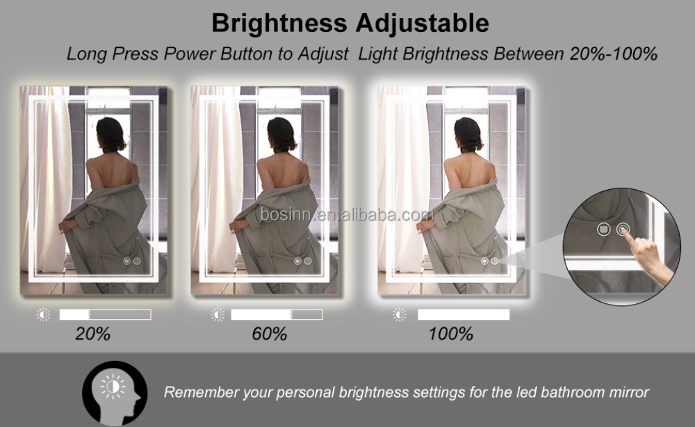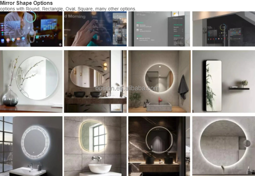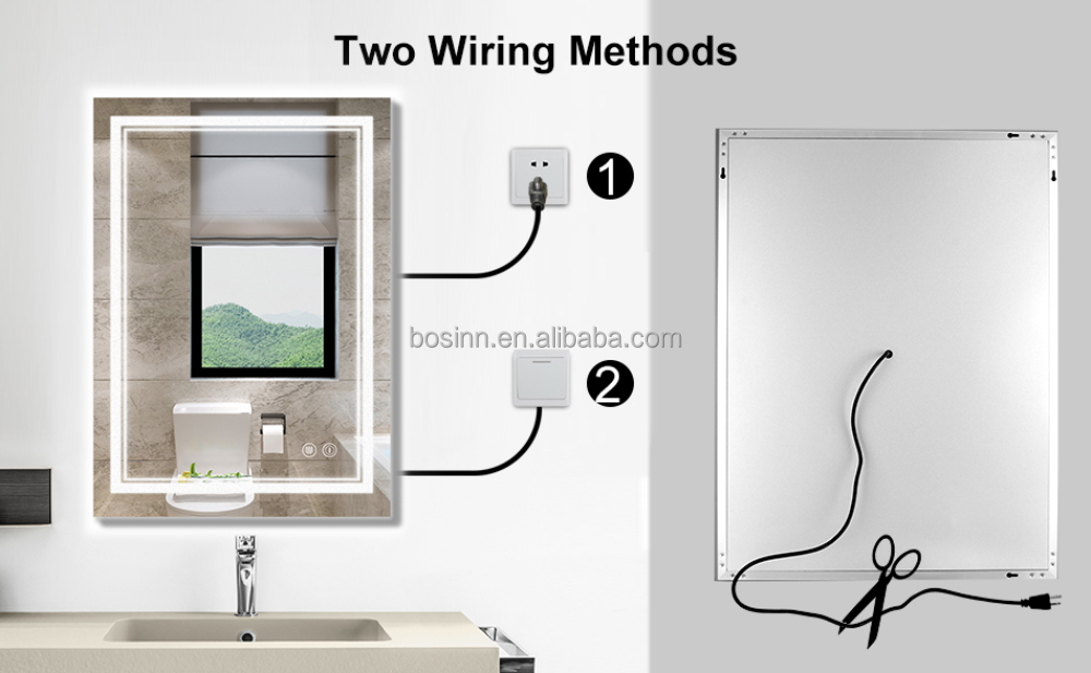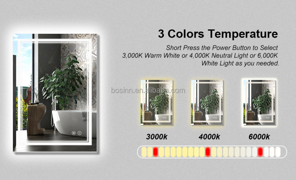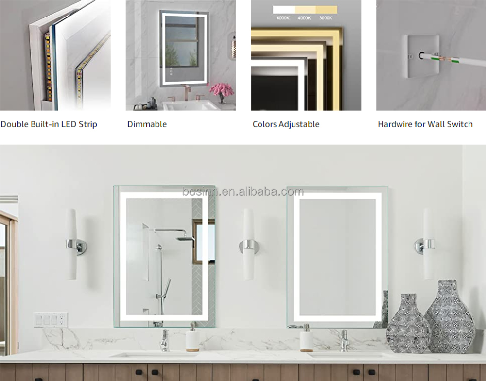 Product material: 5mm environmentally friendly copper-free silver mirror 5mm thick third-generation environmentally friendly silver mirror, automotive-grade float glass, copper-free and lead-free, anti-corrosion, no fingerprints. Product size: 66*66, 88*88, 120*120 or customized size Shape: Rectangular, Square, Round, Irregular, Customized Input voltage (V): AC85~277V (50/60Hz) Power: 8-50W Color temperature: 3000-6500K Protection class: IP44 LED Stripe Features: LED light strip, energy saving Rate Watt: 4.8W/m Working life: 50000 hours CRI: high color rendering index (CRI>80) LED mass: 60pcs/m Waterproof, anti-fog, explosion-proof With light, anti-rust, zoom, remote control, etc. Touch switch, defogging pad, time and temperature, speaker and other functions are optional Custom shapes, sizes, patterns, frames LED digital clock, LED night light Magnifying glass, shaver socket, glass shelf Radio, temperature display, bluetooth speaker, WIFI Switches: On/Off Touch Switch, Dimming Touch Sensor, Infrared, Pull Switch Custom Logo Laser Printing |