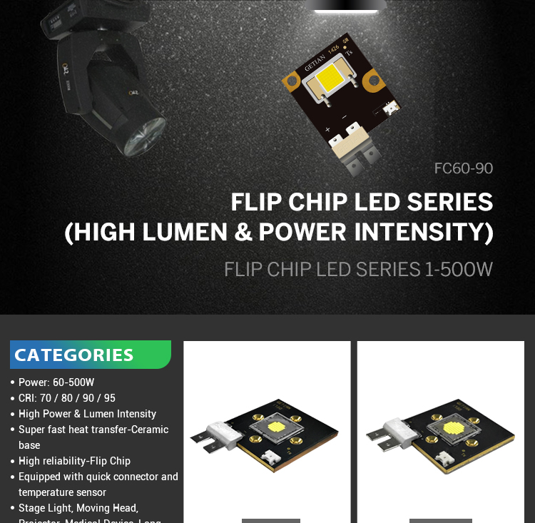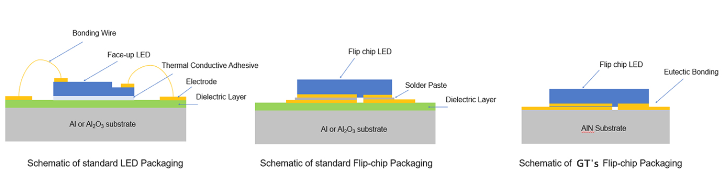 2. Compared with standard flip-chip packaging technology, the eutectic bonding between LED chip and substrate in GETIANLEDS flip-chip packaging technology makes the whole device have excellent thermal conductivity.
