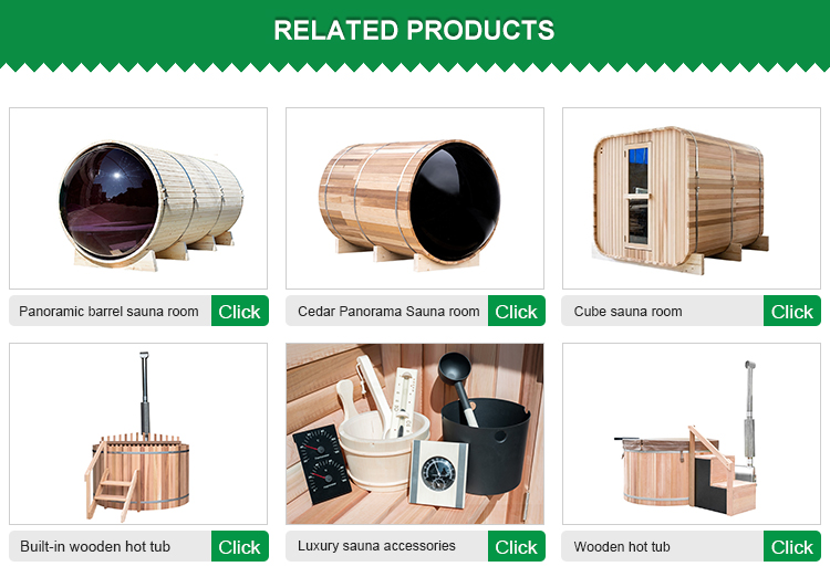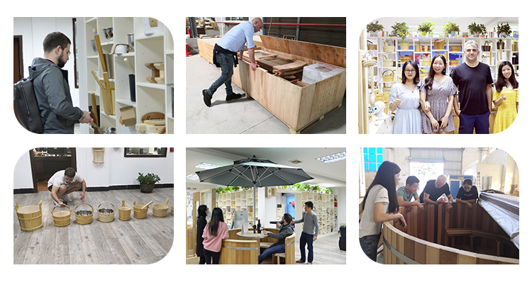 The main products cover 350 kinds of sauna accessories (sauna barrel, spoon, hourglass, thermometer and hygrometer, backrest, headrest, sauna lamp, lampshade, brush and other wood/bamboo/aluminum/stainless steel series.), outdoor sauna room (outdoor barrel/ Olive/Sqaure/Soli type etc.) and wooden hot tubs (electric and stove hot tubs).