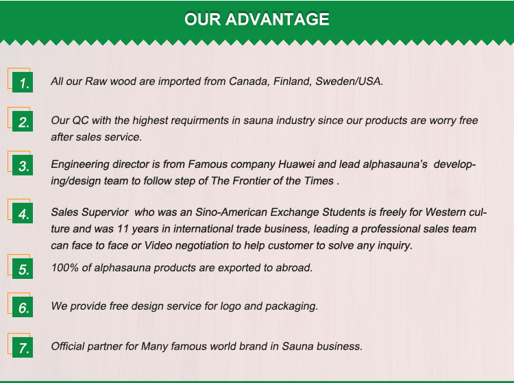 Alphasauna insists on providing the highest products in the market, pursuing fashion and exclusive designs for our customers, guaranteeing timely delivery, and strictly adhering to commercial confidentiality agreements. So we have won the trust of customers at a super fast speed over the years. As a company that 100% exports sauna products to foreign countries, we help customers expand their online and offline market share. Propose different items and provide professional packaging methods according to different market channels. If you are in traditional sauna trading business, you can get one-stop service from Alphasauna, if you want to create your own business, you can try small quantity like 1-50PCS for trial order to test from Alphasauna. Sincerely welcome to contact us for future business.