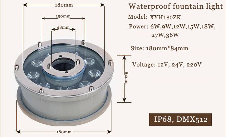 Light body material: Stainless steel model: DMX512 lights Supported dimmers: Yes light source: to lead Working life (hours): 50000 Protection class: IP68 Working hours (hours): 50000 Color temperature (CCT): 5000K (sunlight) application: landscape Item Type: fountain lights Package preview: Lamp...... -