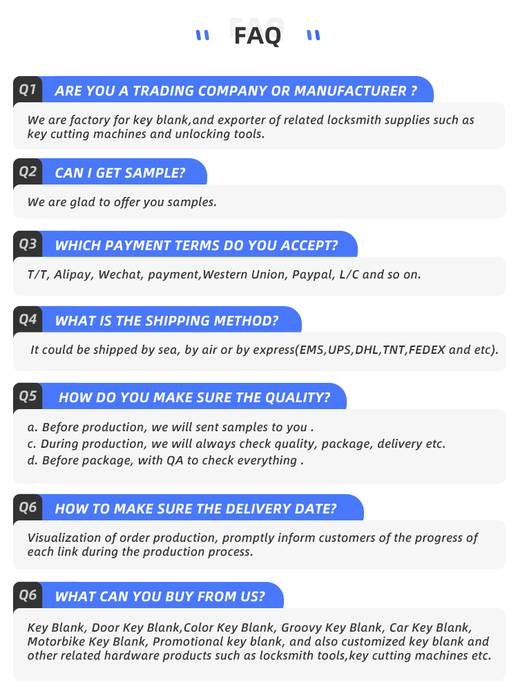 | Packaging Details: | 100PCS, small box, 2000/2500PCS per carton | Accepts OEM key blanks: | Customized key blanks can be made according to your drawings or samples. |