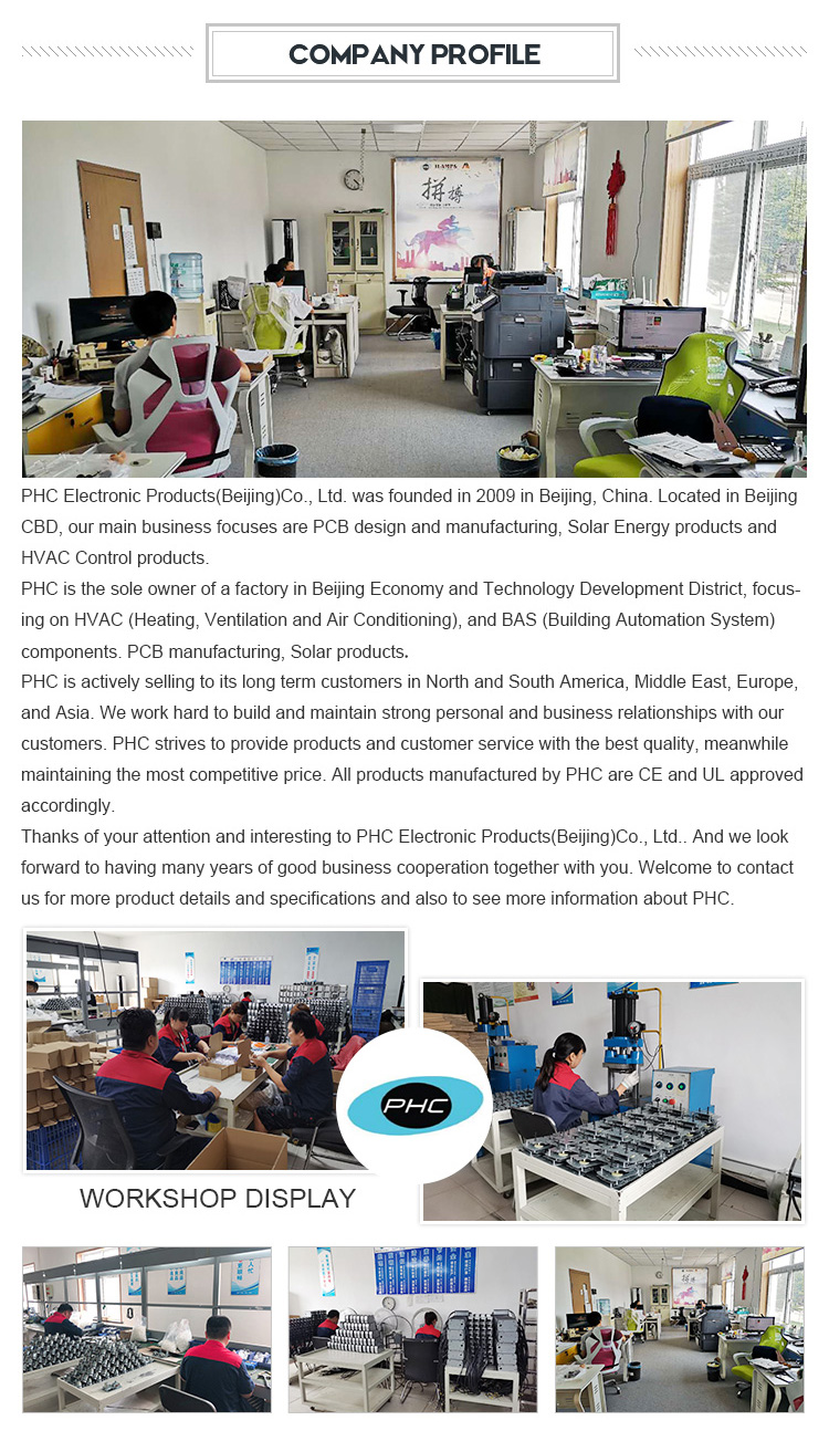 | PHC is the sole owner of a factory in the Beijing Economic-Technological Development Area, focusing on HVAC (Heating, Ventilation and Air Conditioning) and BAS (Building Automation System) components. PCB manufacturing, solar products. PHC is actively selling to long-standing customers in North and South America, the Middle East, Europe and Asia. We strive to build and maintain strong personal and business relationships with our clients. PHC strives to provide the highest quality products and customer service while maintaining the most competitive prices. All products manufactured by PHC have the appropriate CE and UL certifications. |