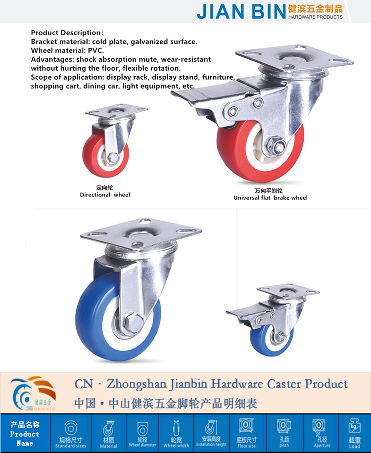 design style: contemporary port: Guangzhou model: I001C color: Red payment terms: L/C, Western Union, D/P, T/T, MoneyGram, Cash, etc. Origin: Guangdong, China size: 1-3 inches Key words: Light duty casters capacity: 10-50kg Certification: ISO Rosh CE certification type: swivel/fixed/side brake,...... -
