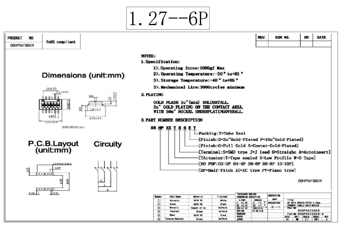 Origin: Guangdong, China Operating temperature: -20℃-+70℃ Certificate: RoHS Current Rating: 0.1A Rated voltage: 50V AC/DC model: DIP switch series Insulation resistance: Minimum 100MΩ Certification: RoHS Directive brand: Shenzhen Tuozhi maximum. Voltage: 50V DC Is it smart: No maximum. current:......
