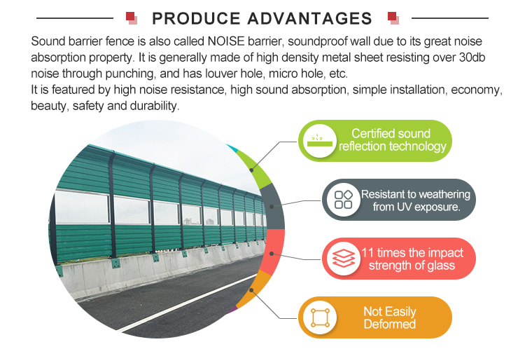 Panel style: Steel plate, PC board model: sound barrier Warranty: 1 year Aperture: custom made Origin: Hebei china payment terms: L/C, Western Union, D/P, D/A, T/T, MoneyGram Supply capacity: 100 tons per month type: noise barrier Sheet Thickness: 0.8-1mm, can be customized design style:......