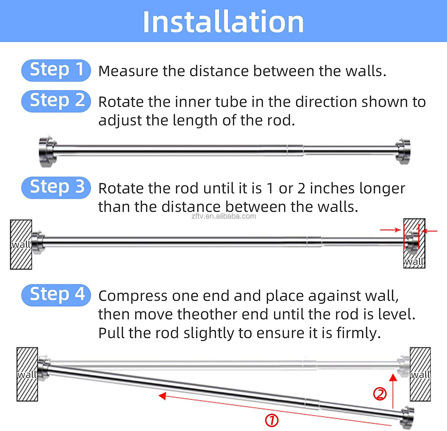 brand: AKH Material: Iron, aluminum, 304 stainless steel Package preview: Install: expand application: bathrooms, hotels, clothing stores type: Shower curtain rod shape: pillar Origin: Zhejiang, China payment terms: L/C, D/P, D/A, T/T size: 1.1m-2.2m, customized product name: Shower curtain rod...... -