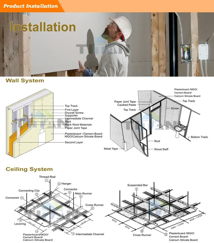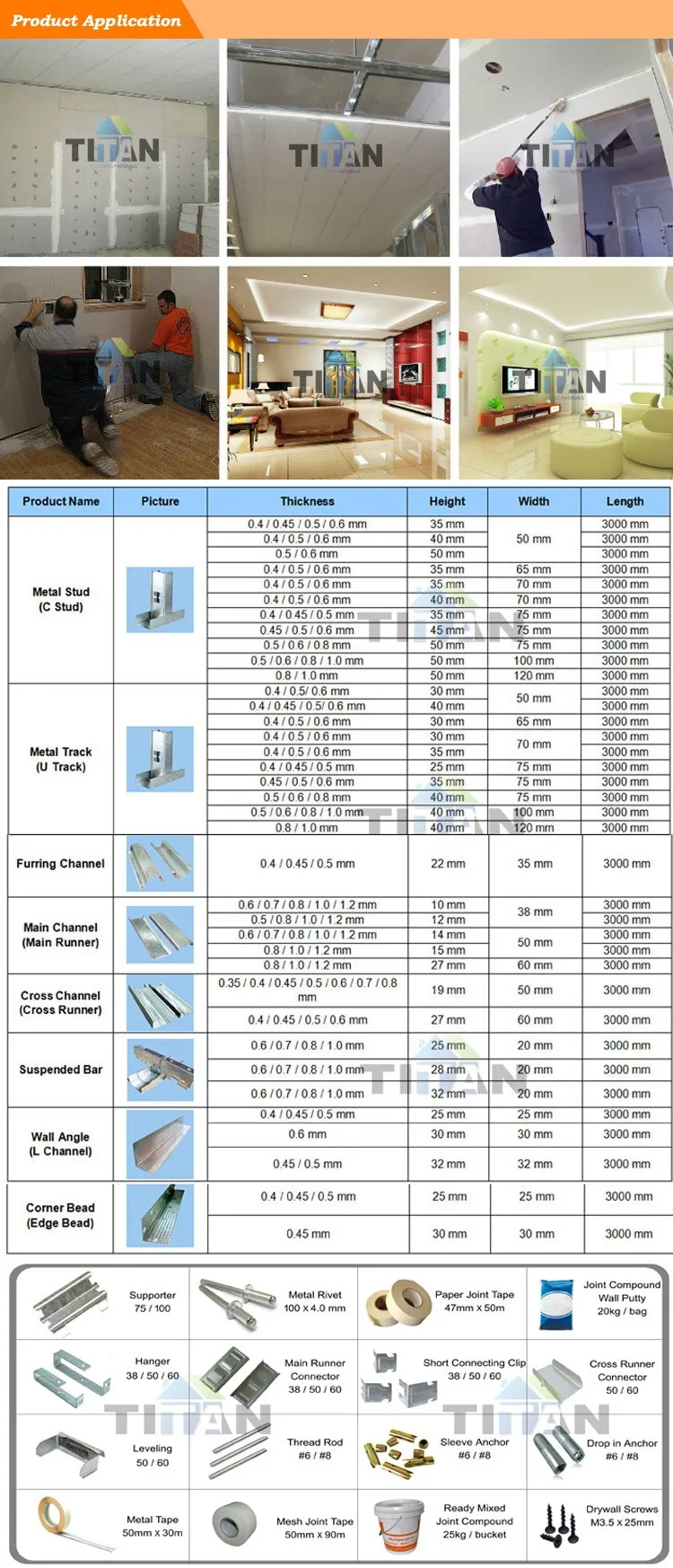 titandrywall,Commonly known as plasterboard, wallboard or gypsum board. It differs from other panel building products such as plywood, hardboard and fibreboard because of its non-combustible core and paper face. When the joints and fastener heads are covered with a joint compound system, gypsum wallboard creates a continuous surface that is suitable for most types of interior finishes. |