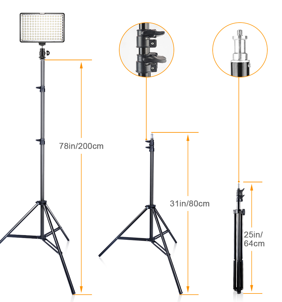 | 78"/200cm High Studio Light Stand (x4) | Sturdy safety 3 leg stage. Simple set-up, quick release and locking system for quick and easy use. Light weight and easy to carry. Material: aluminum Maximum height: 78 inches / 200 cm maximum. Load: 10-15kg / 22-33bls |