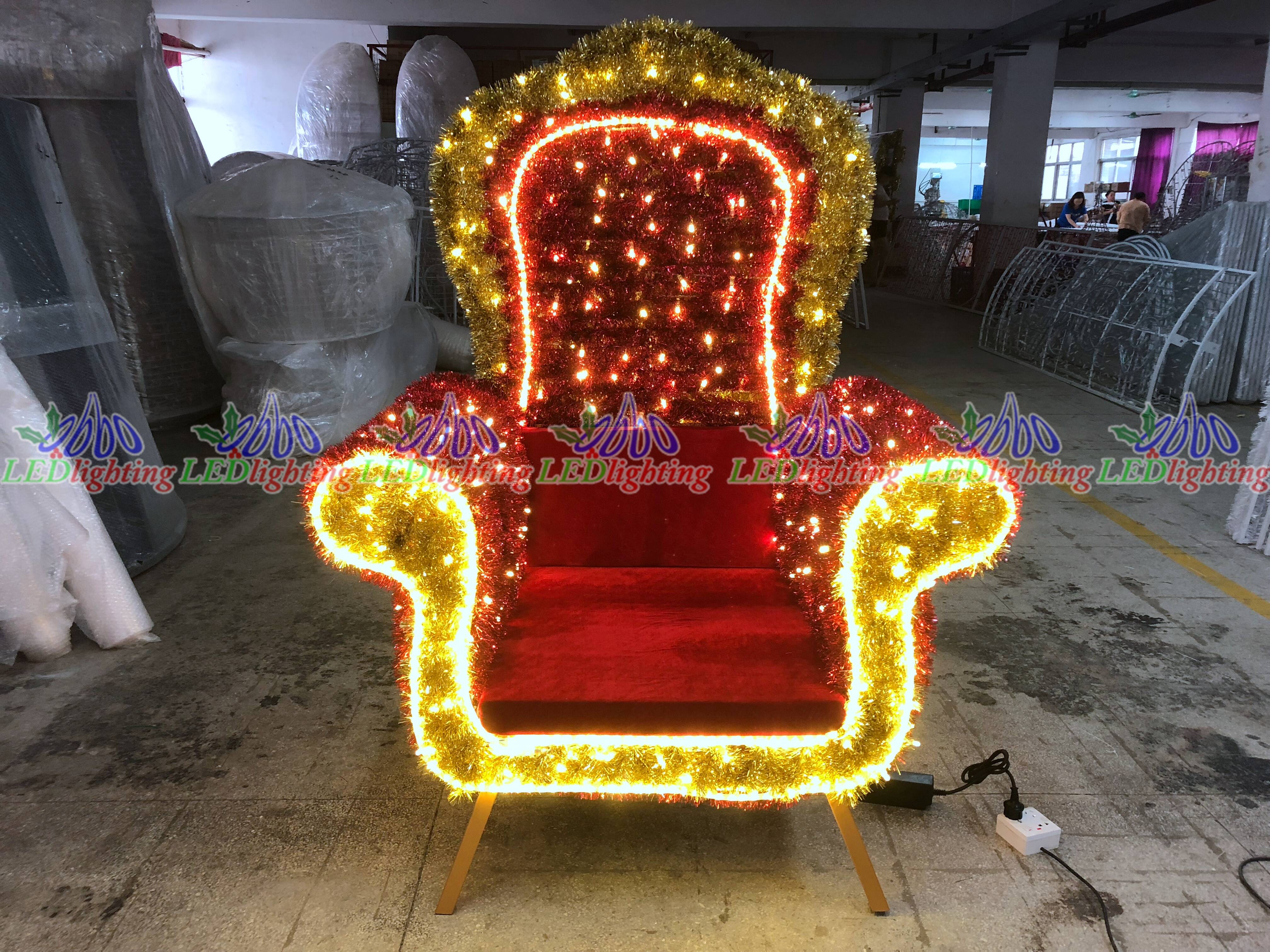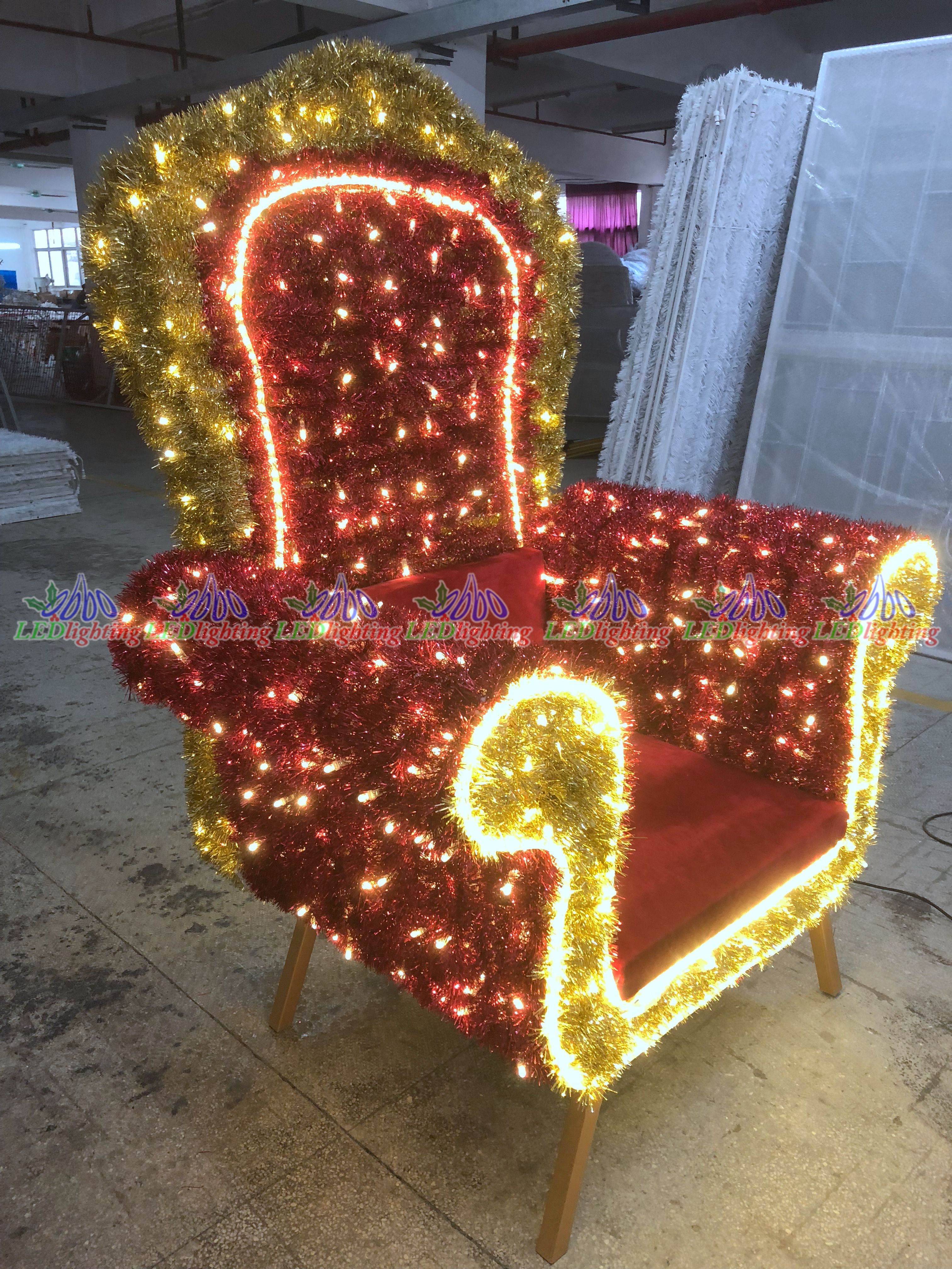 Interior illuminated christmas decorations and santa throne santa chairs in shopping center