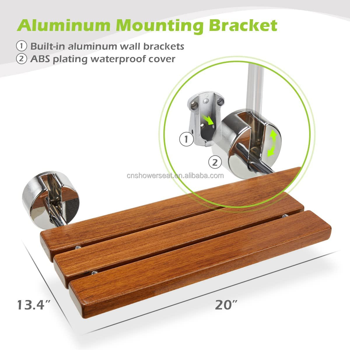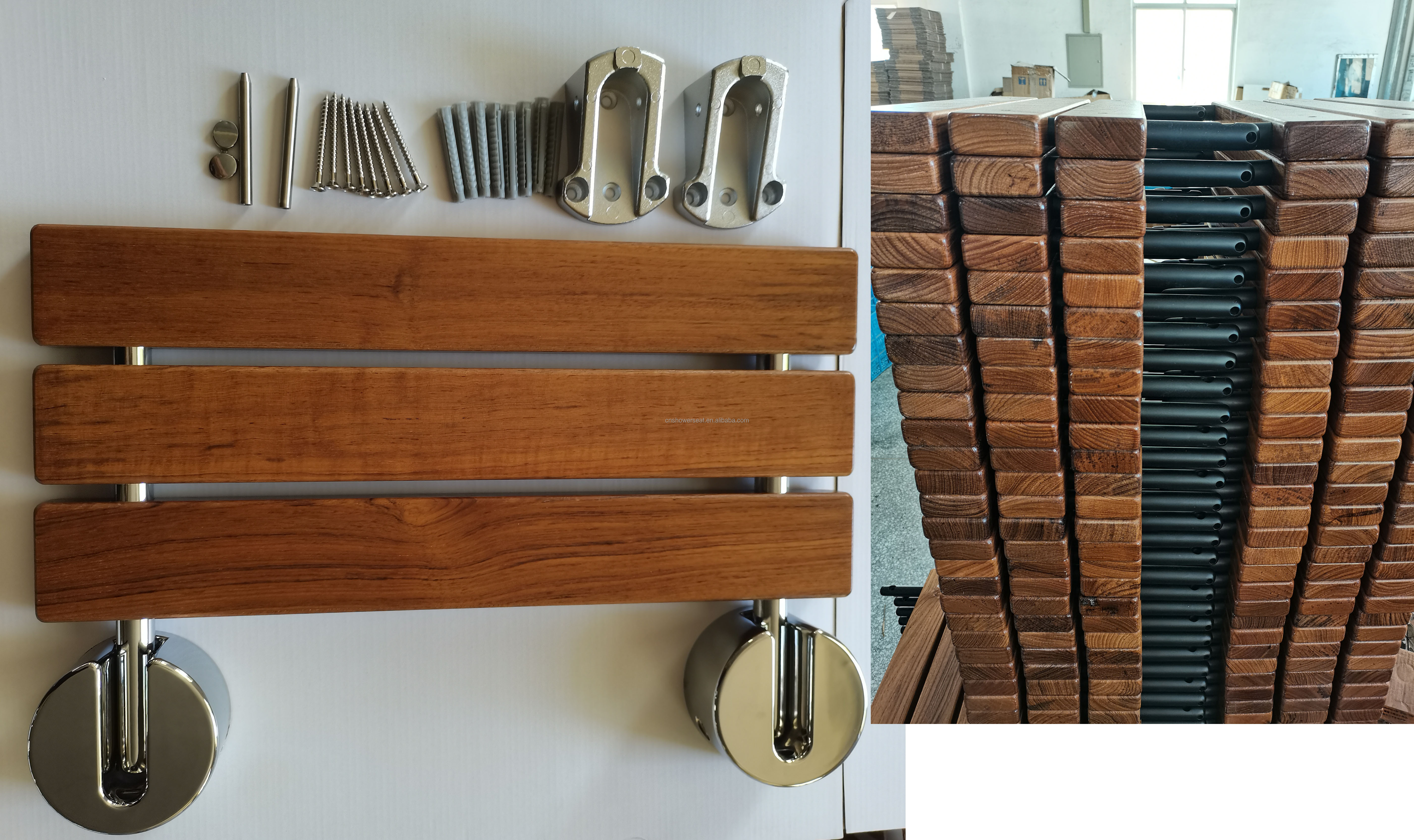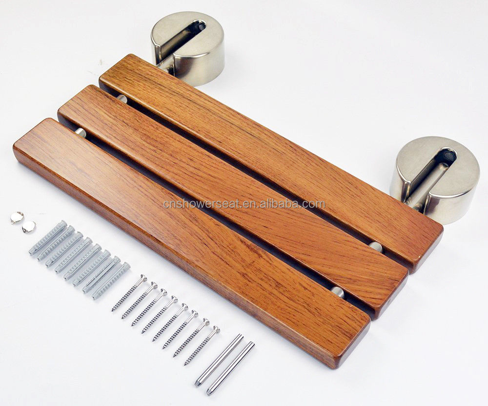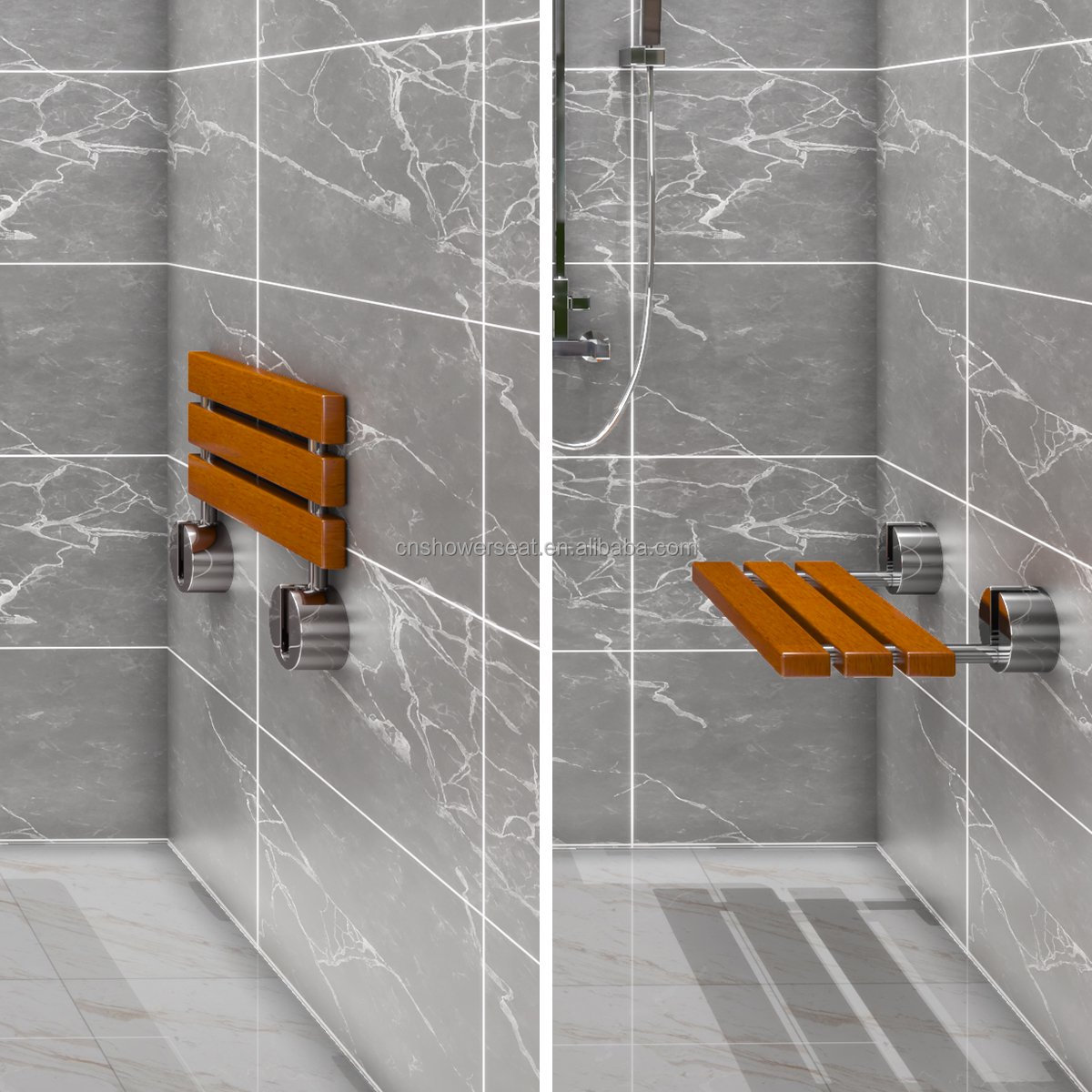 The tilt-up seat easily mounts to any wall and conveniently tilts up after use, requiring minimal space. It is made of selected moisture-resistant teak supported by a brass tubular frame. The frame is available in a chrome finish to enhance the design.
