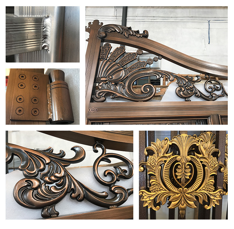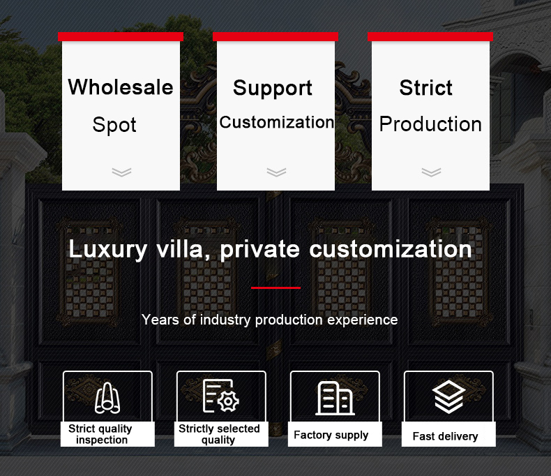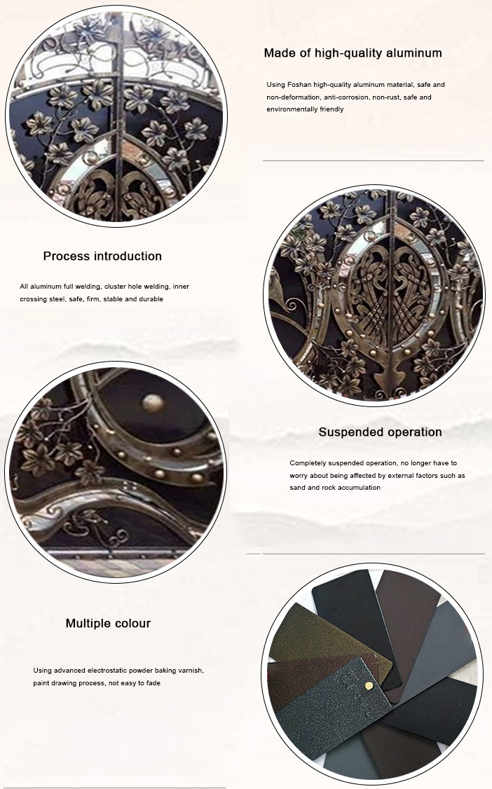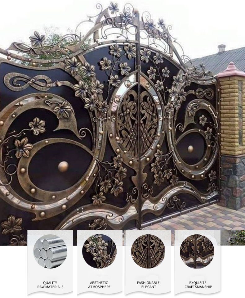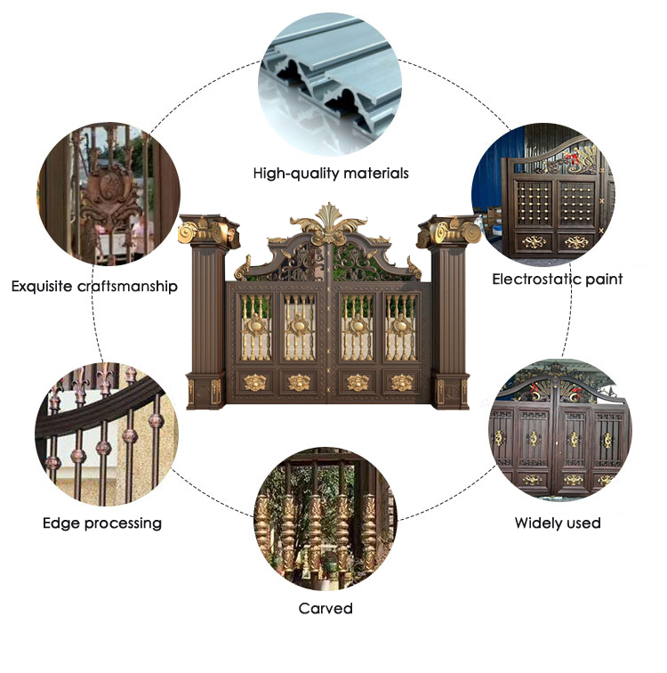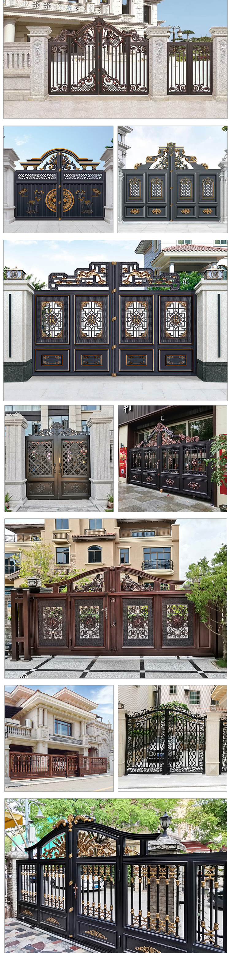 .The gate is made of aluminum alloy/iron/stainless steel profile and cast aluminum trim, which is anti-corrosion and non-rusting.