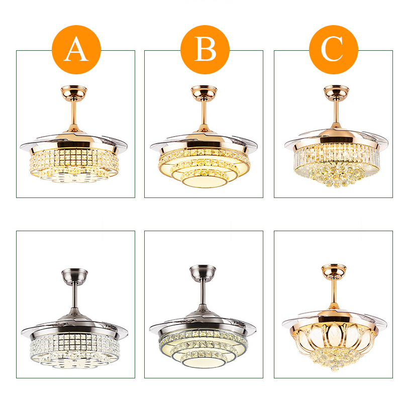 Modern New Dimmable 42 Inch Crystal Ceiling Fan With Light Remote Invisible Retractable Chandelier Fan Light