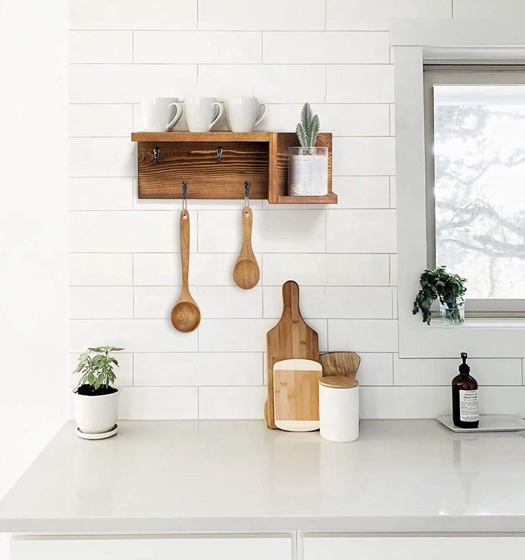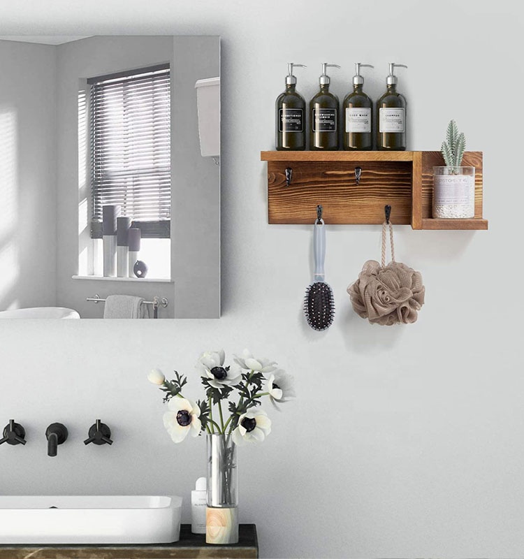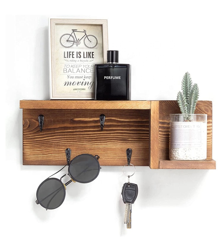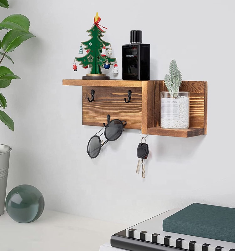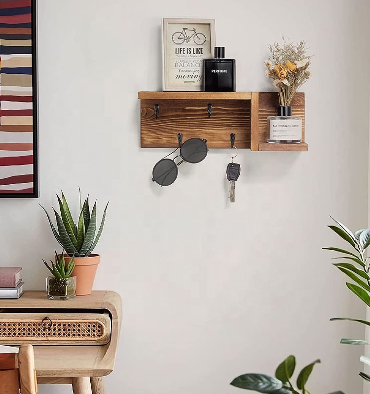Wooden Keychain for Wall Decor Mail and Keychain Organizer with 4 Key Hooks and "Z" Shape Wall Mounted Floating Shelf, Rustic Home Decor for Wall, Entryway, Mudroom, Bathroom