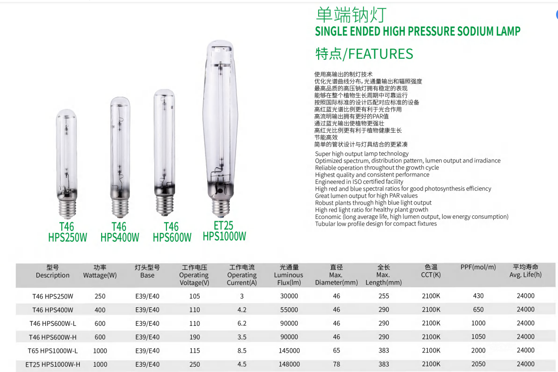Working hours (hours): 25000 Lifespan (hours): 25000 brand: gardening Package: carton style: unique modern art Bulb Type: ETC Lamp Luminous Efficiency (lm/w): 100 Color rendering index (Ra): 95 Warranty: 3 years product name: HPS Double Ended Grow Bulbs Lighting Solutions Services: online technical.... -