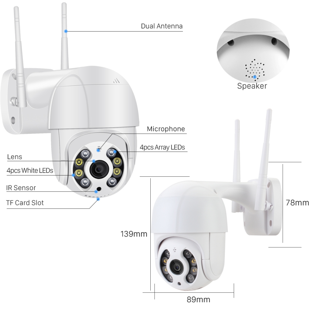 PTZ lens: 3.6mm fixed focus lens Video storage: Support TF card storage and cloud storage strength: DC12V2A Infrared LEDs: 4 warm lights + 4 common infrared LED lights product name: WIIF camera style: Dome camera, PTZ camera Warranty: 2 years model: D1 special function: Human motion tracking, face.....