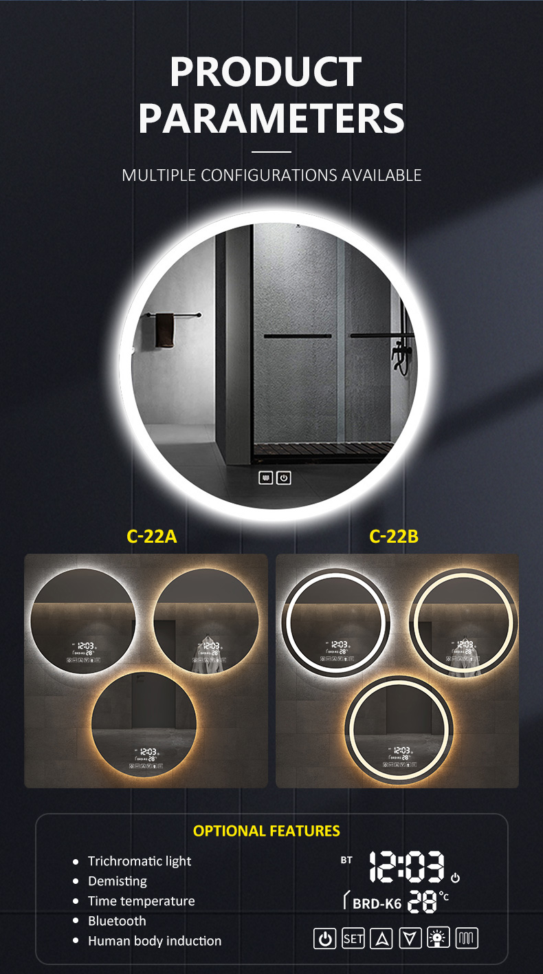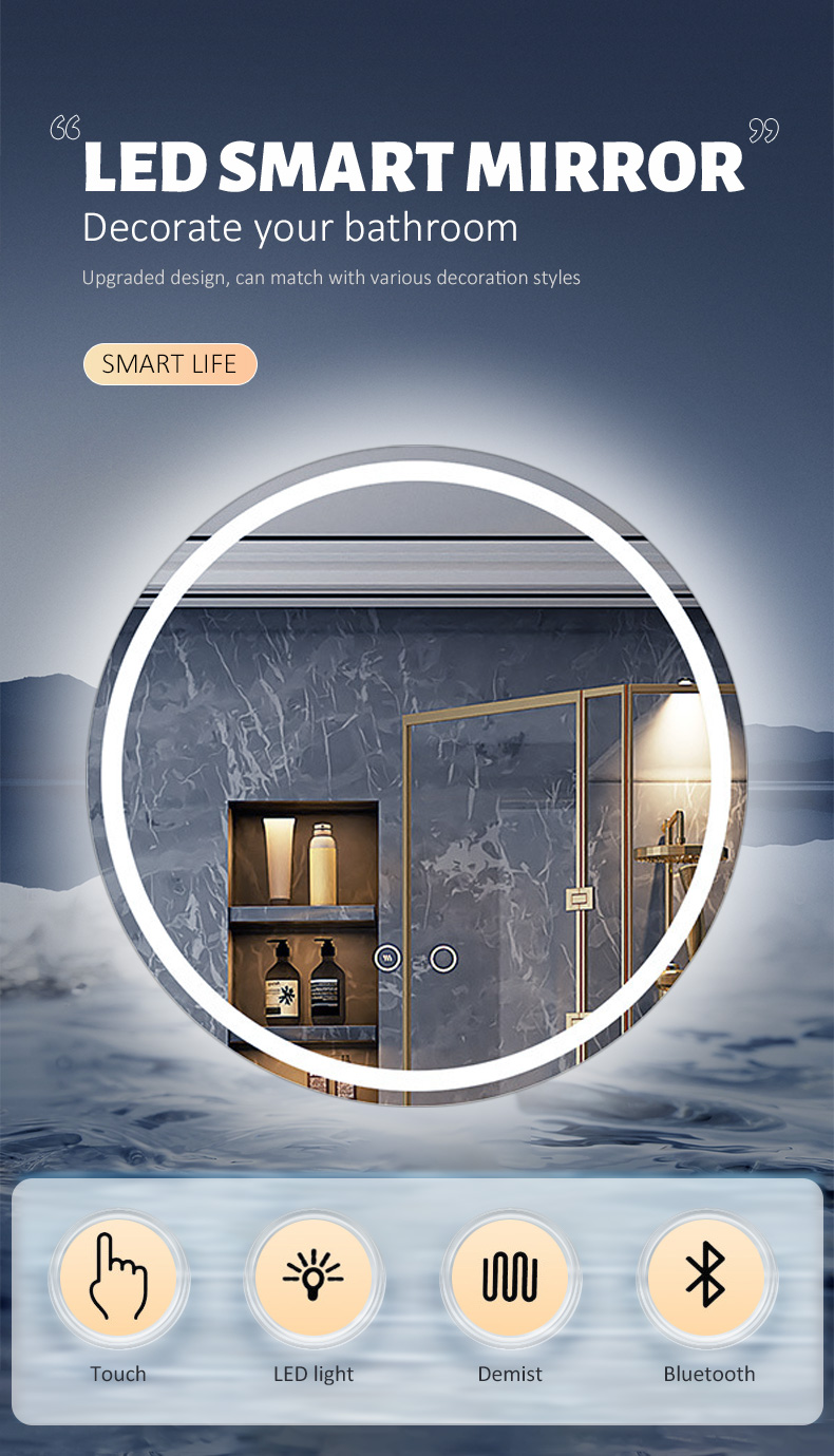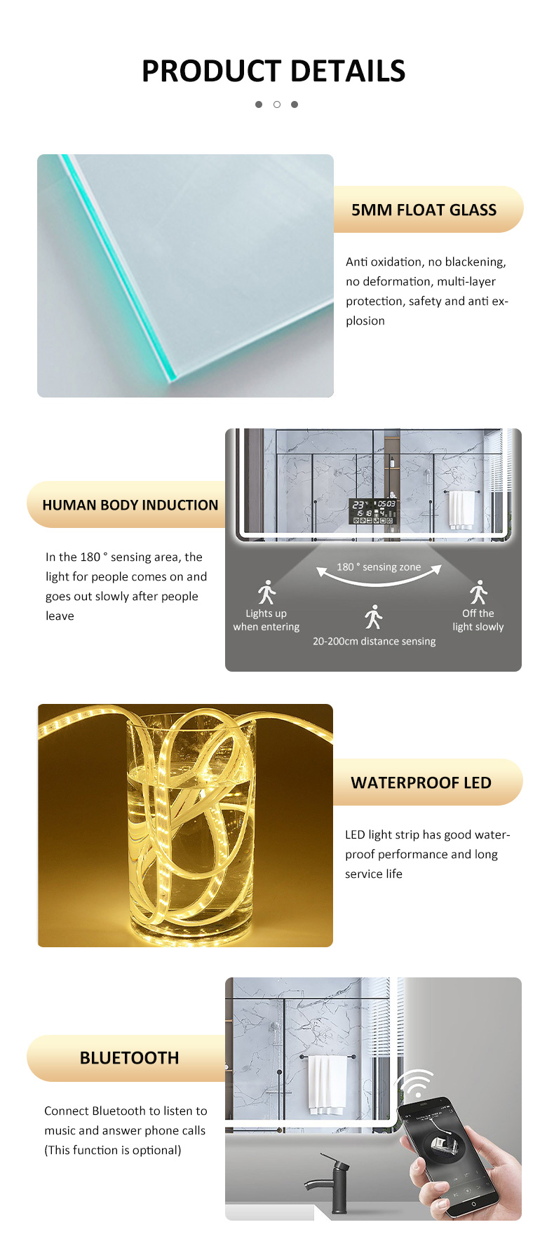 | mirror material | Ultra HD 5mm silver mirror with waterproof LED light strip, optional function switch |