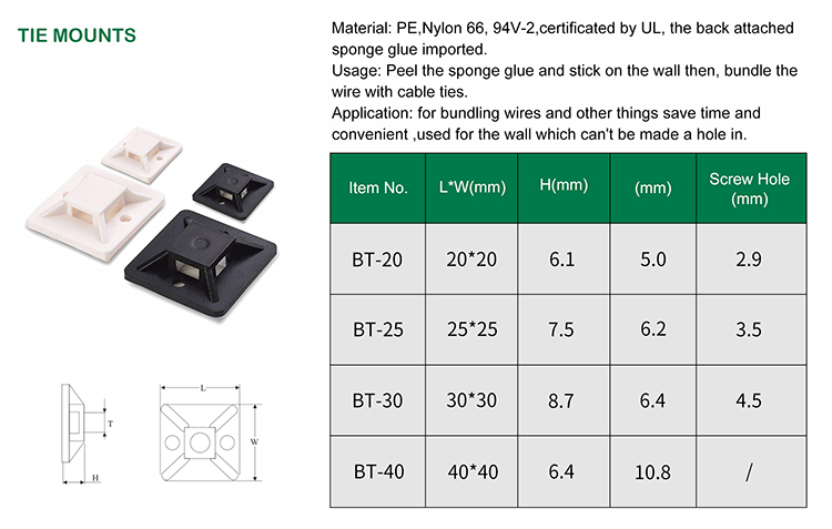 type: Adhesive cable tie installation non-flammable: 94-V2 rating Material: polyethylene model: MG-25 color: black and white Packaging Details: Ordinary packing: Certain pls + Blank poly bag + Neutral Label + Export carton (B) Special packing: a. Color printed plastic bag + export carton b. Color...... -