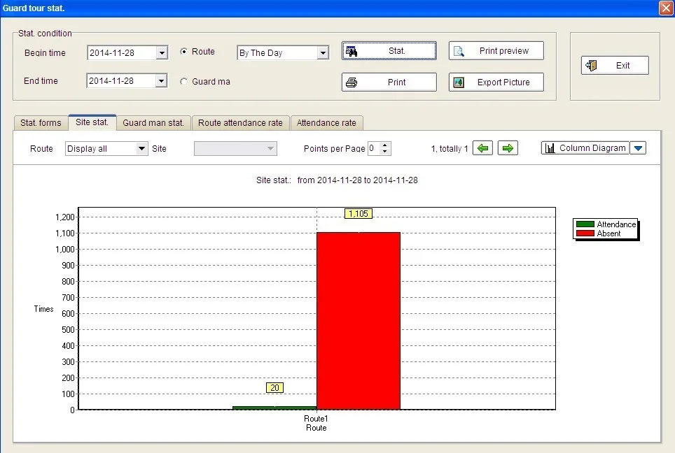 As you can see, if the doorman is not patrolling at the time you requested, our software will show it to you in a yellow section. The software is easy to operate.