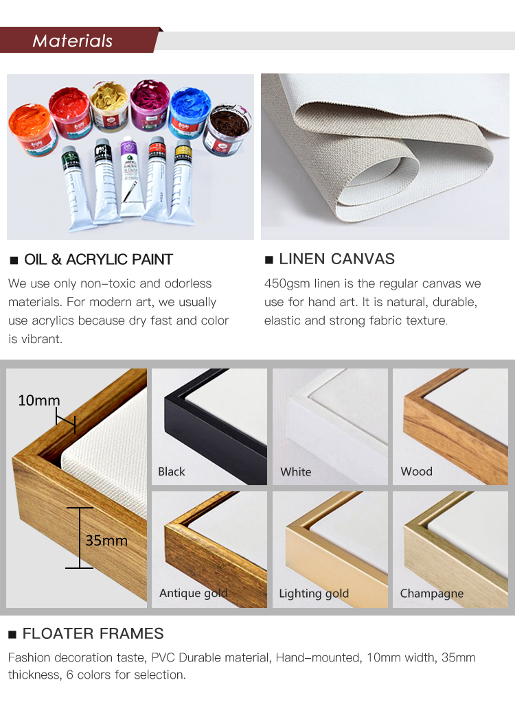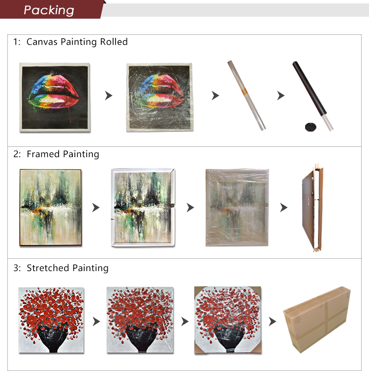 ID: custom logo payment terms: L/C, Western Union, T/T, MoneyGram decorate: Bar, home, hotel, office, coffee shop, gift Moderate: Oil Floating frame: Various frame colors available Packaging Details: Packaging instructions: 1. Frameless unstretched painting: rolled up with a tube, covered with...... -