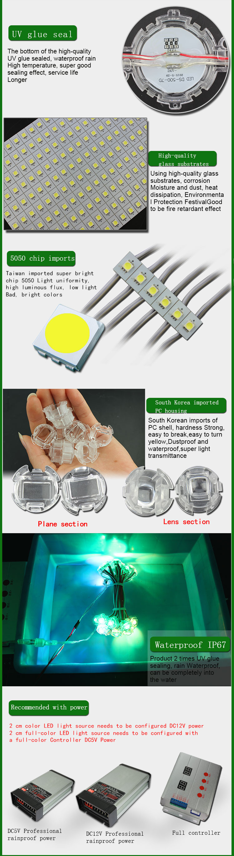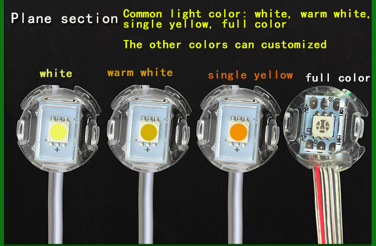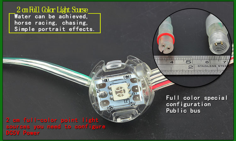 Protection class: IP68 Warranty (year): 2 years LED color: RGB Input voltage (V): DC5/12V Color temperature (CCT): RGB IC Luminous color: RGB port: Sheng Zheng Item Type: point Light Working life (hours): 50000 type: WS2811/UCS1903/SM16703 Working temperature(℃): -40 - 65 Light body material: ABS...... -