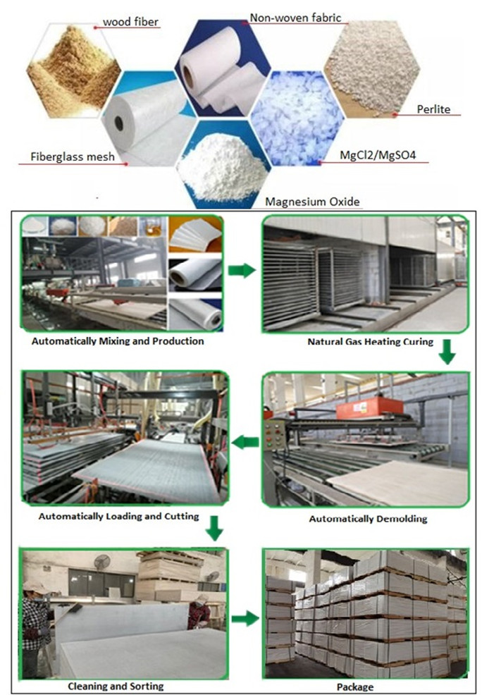 Magnesia board (also known as magnesium oxide board, dragon board, Magna board or magnesite board) is a new green and technologically advanced building material, compared with traditional wood, gypsum and cement-based products, it is in various Excellent performance in all categories. It is virtually impervious to fire, insects, and does not grow mold. Non-toxic, non-flammable, and non-combustible; high compressive strength and impact resistance allow it to be used as a structural element, and its water and moisture resistance properties make it highly versatile for almost any construction or renovation project. The board is very easy to work with and can be advantageously cut and broken like plasterboard.