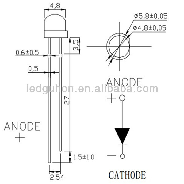 payment terms: L/C, Western Union, D/P, D/A, T/T, MoneyGram, PayPal Supported dimmers: No brand: Dysprosium color LED Chip brand: Epileds Sanan Lifespan (hours): 50000 application: display, light product name: Through Hole 4.8mm 5mm Straw Hat LED Diode Package preview: maximum. Reverse voltage: 5V..... -
