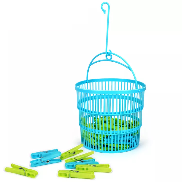 Plastic Hanging Clothes Basket with 24 Clothes Nails Hanging Clothesline Windproof Strong Clip with Clothespin Storage Basket
