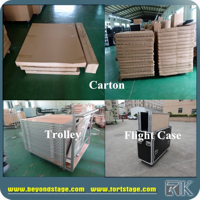 Supply capacity: 5000 pieces per month Warranty: 3 years Packaging Details: Flight case, carton + bubble bag floor color: white/black/walnut edge: aluminum product name: dance floor platform usage: Events, parties, weddings, etc. model: RKWL-PFP462-771 Package: Trolley/carton/air case size: 2'x2',..... -