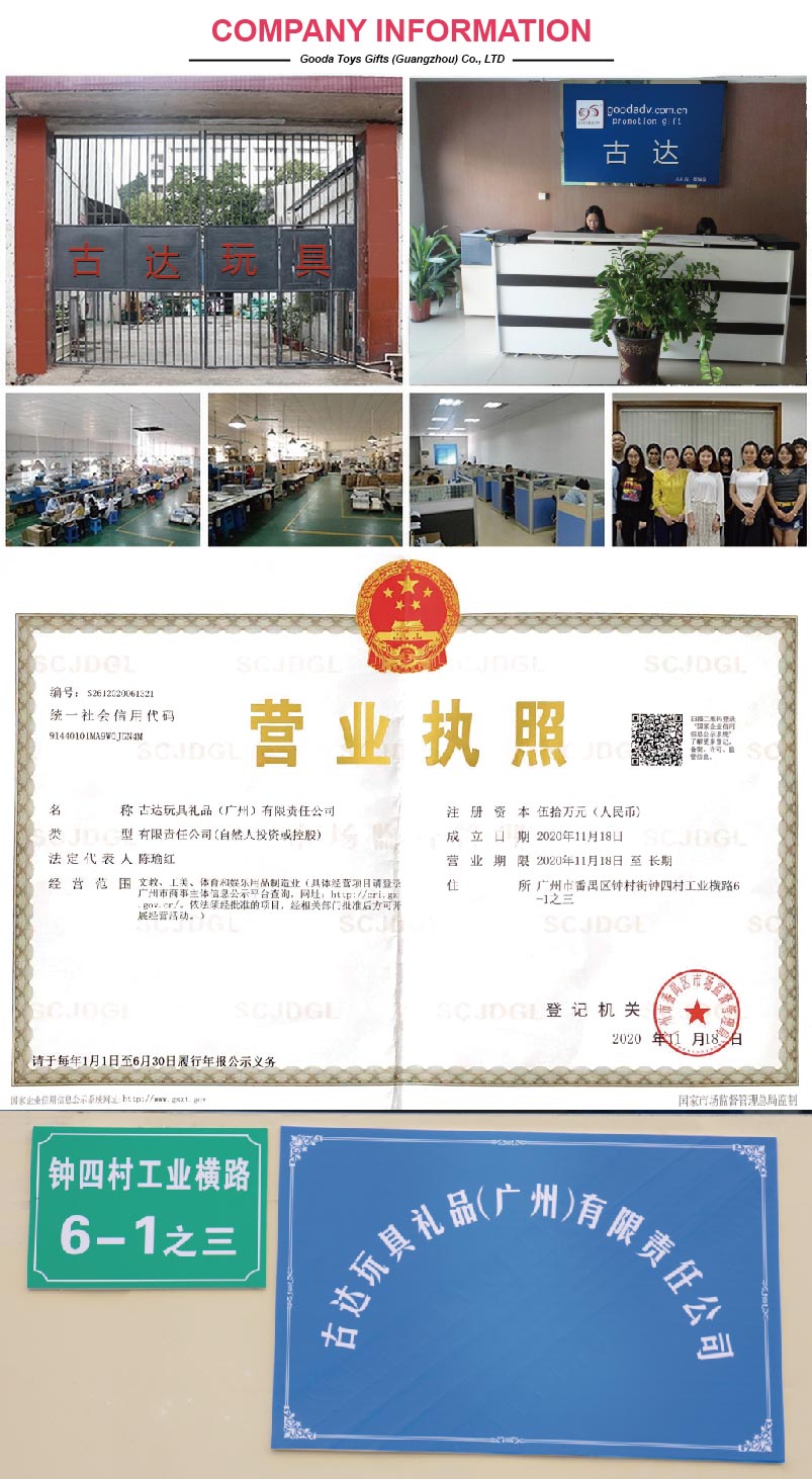 Guda Toys & Gifts (Guangzhou) Co., Ltd. is a professional manufacturer in Guangzhou. It is located in Guangzhou, Guangdong Province. It has been engaged in this industry for more than 20 years. It has more than 50 employees and more than 1,000 employees. We can customize the OEM/ODM design, size and shape of the goods.