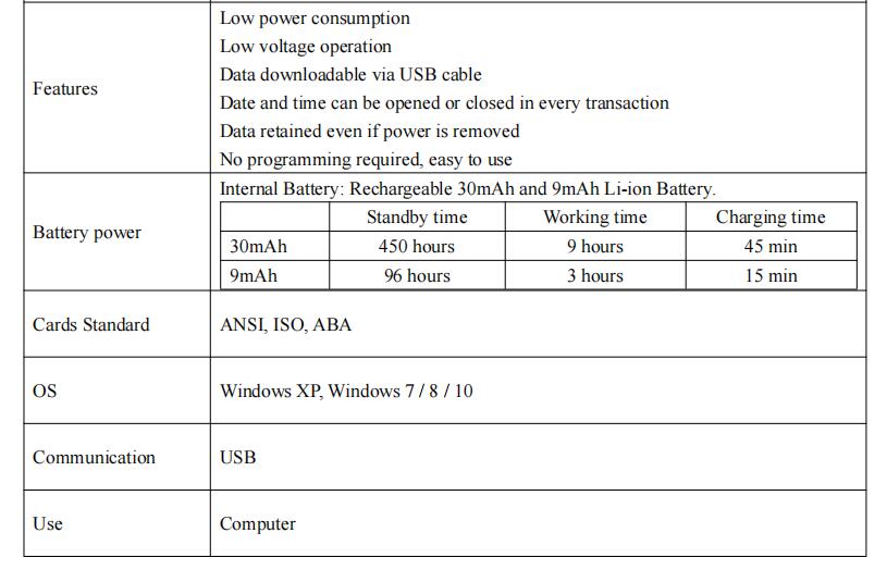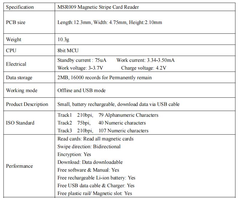 This MSR010 can read all 3 tracks on the magnetic card. It has very low energy consumption and can stay in working mode for about 6 days/145 hours with a 9mAh battery. All data is recorded in the device memory, which can hold up to 8000 records.