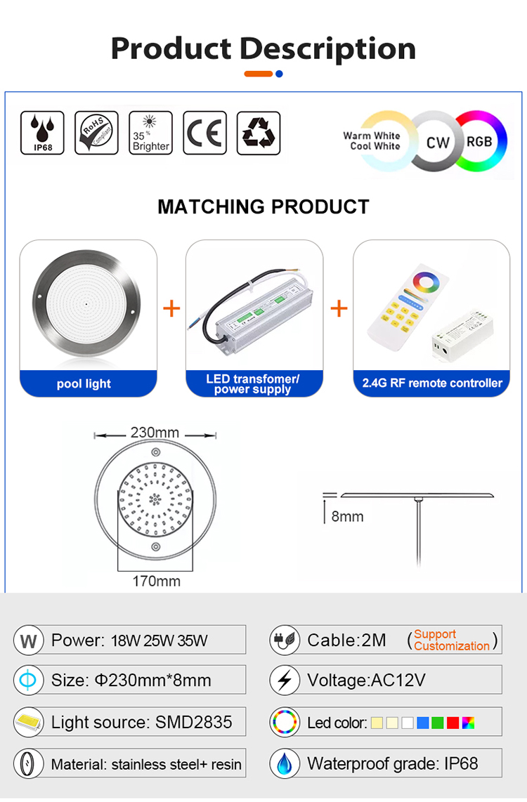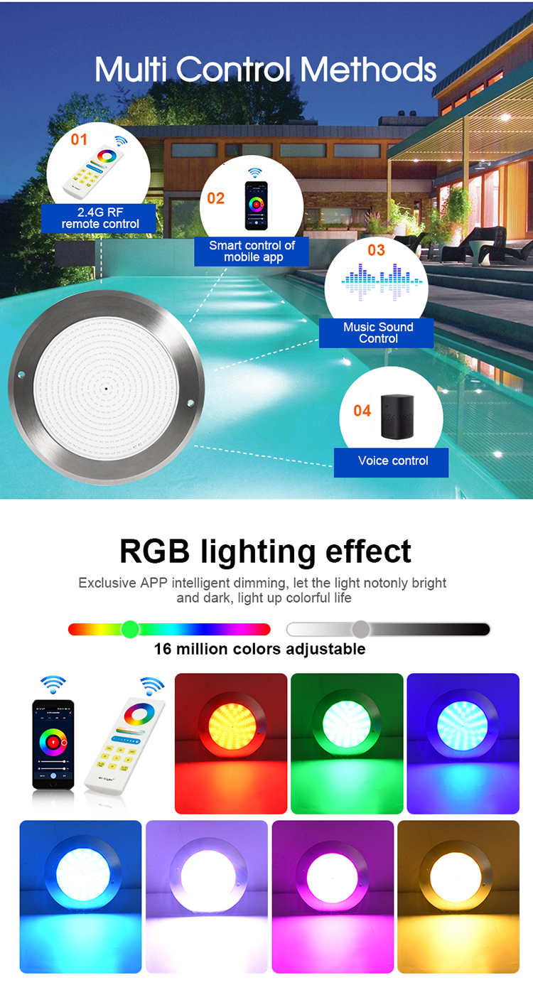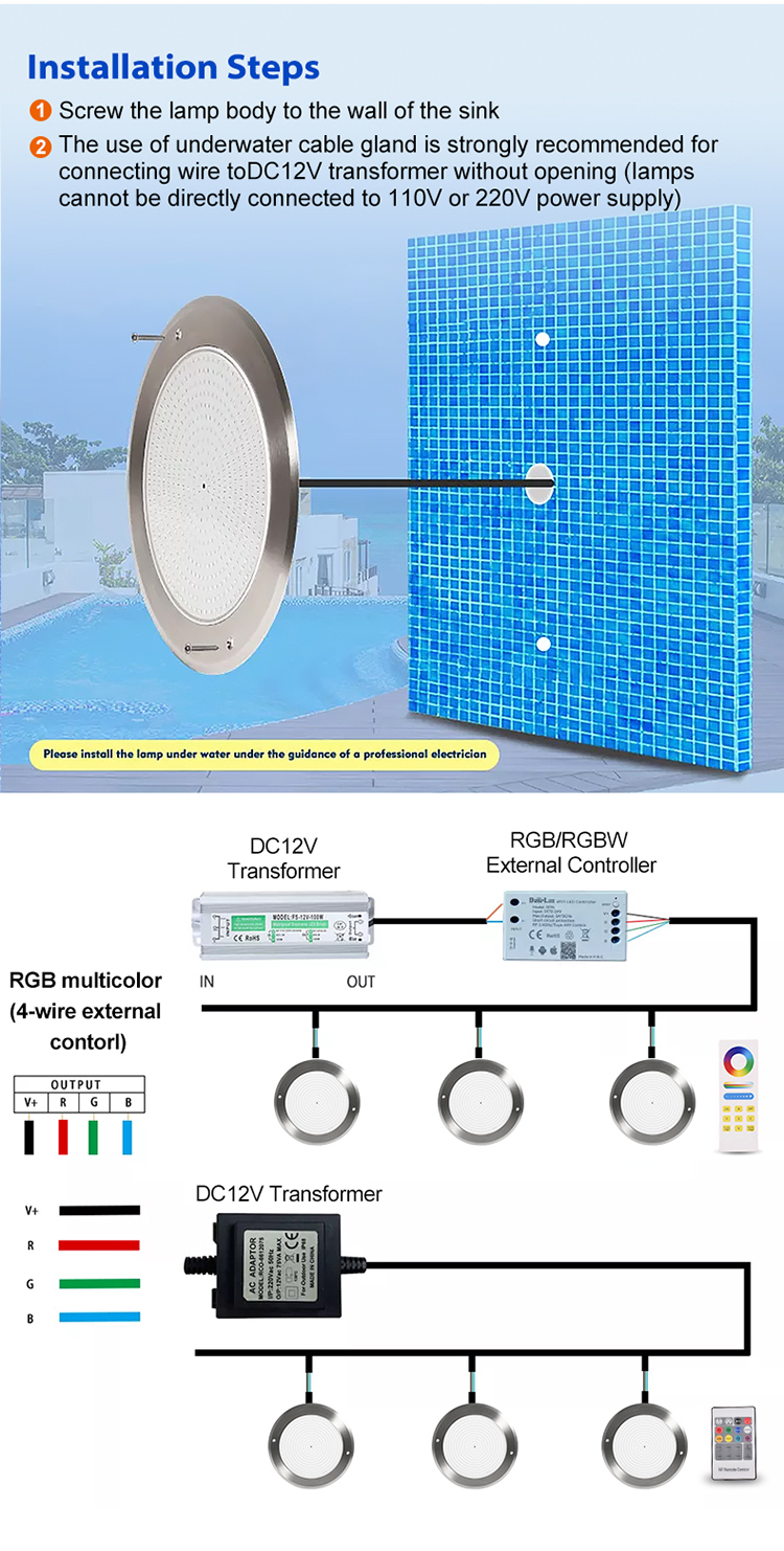 Color temperature (correlated color temperature): RGB/warm white/white/red/green/blue, 2700K (soft warm white) Input voltage (V): AC12V/DC12V, AC 12V Place of origin: Guangdong, China control method: Remote/switch/external control/wifi Key words: Underwater application swimming pool LED lights...... -