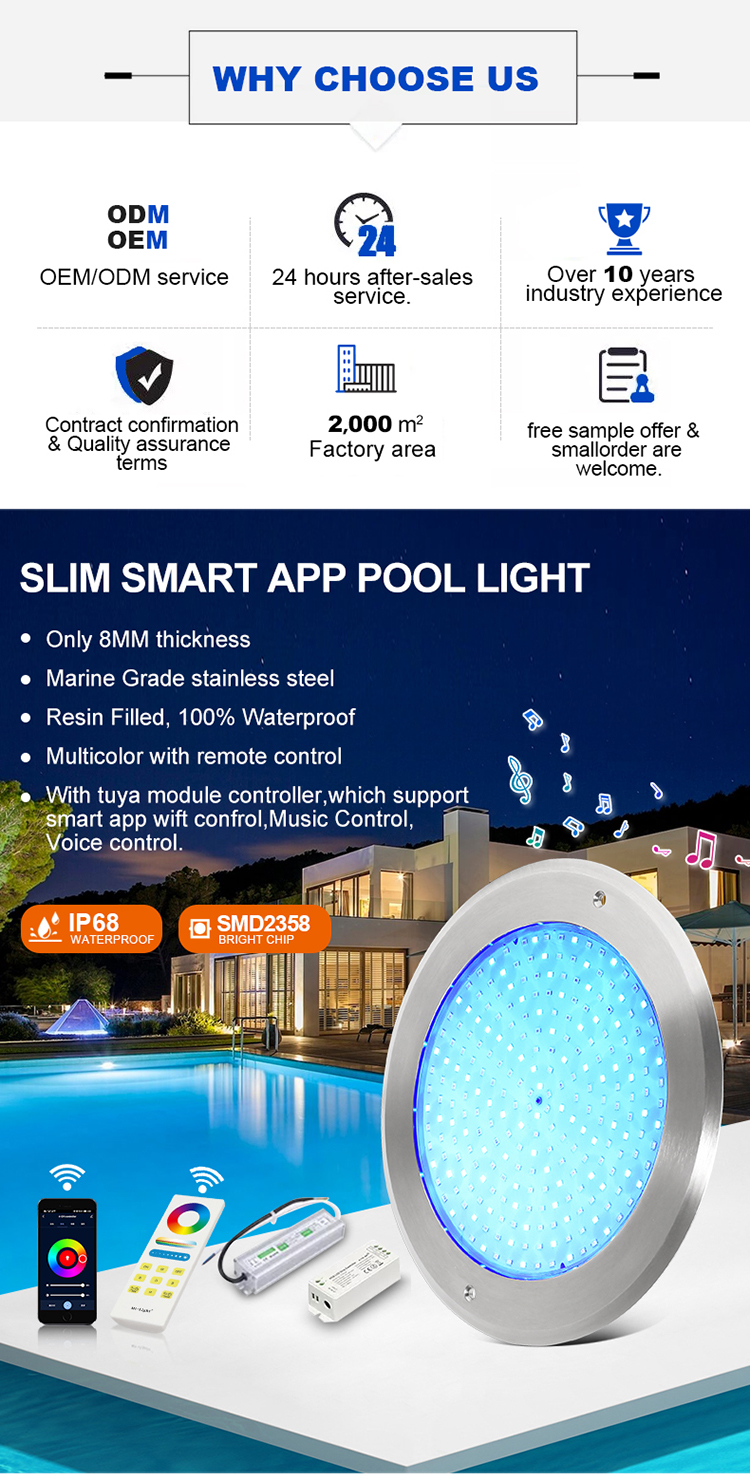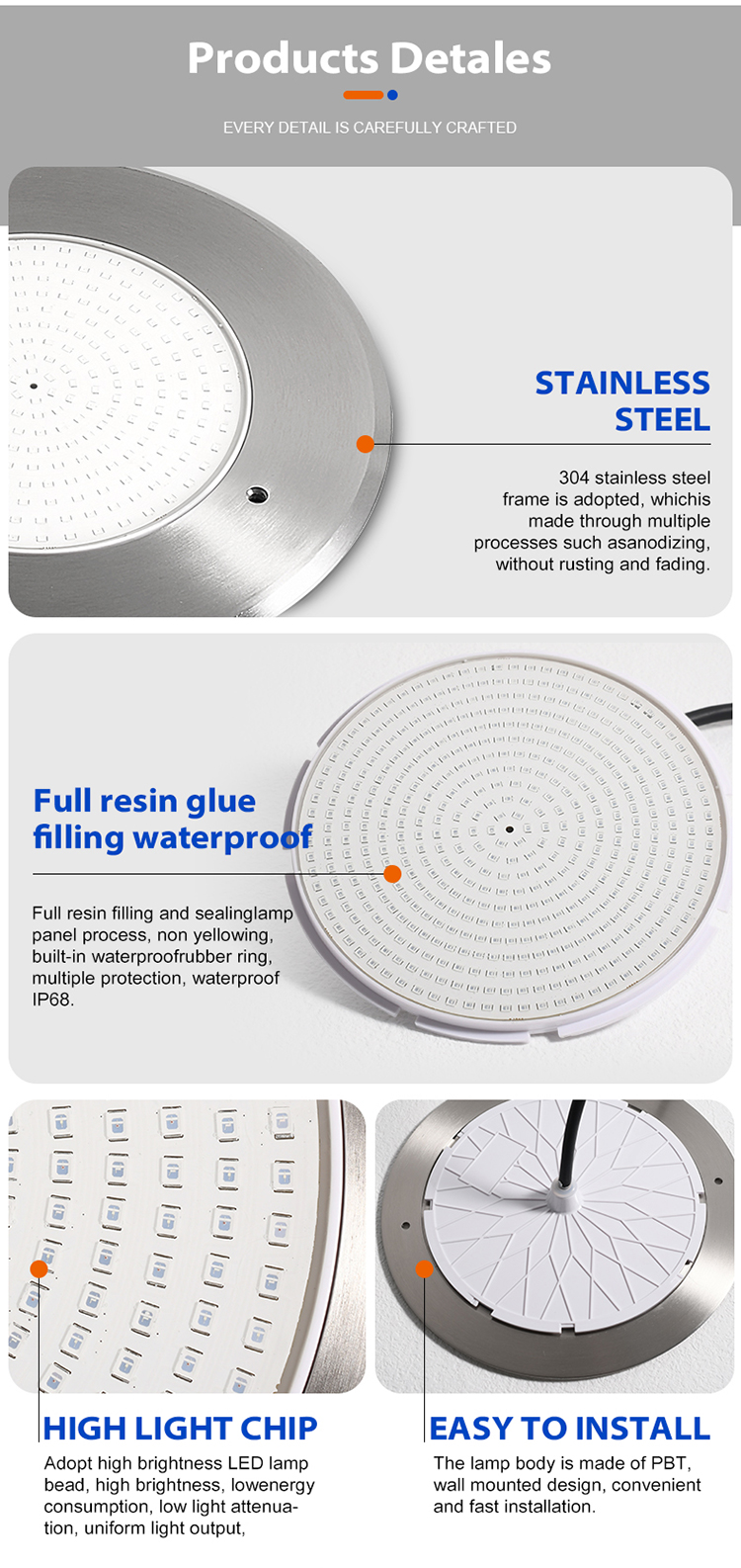 application: swimming pool Input voltage (V): DC 24V brand: Plux product name: Wall Mounted Resin Filled Pool Lights Origin: Guangdong, China Carob: 120° Protection class: IP68 Item Type: swimming pool lights Working hours (hours): 50000 LED chips: SMD 2835 Working life (hours): 50000 Light body...... -