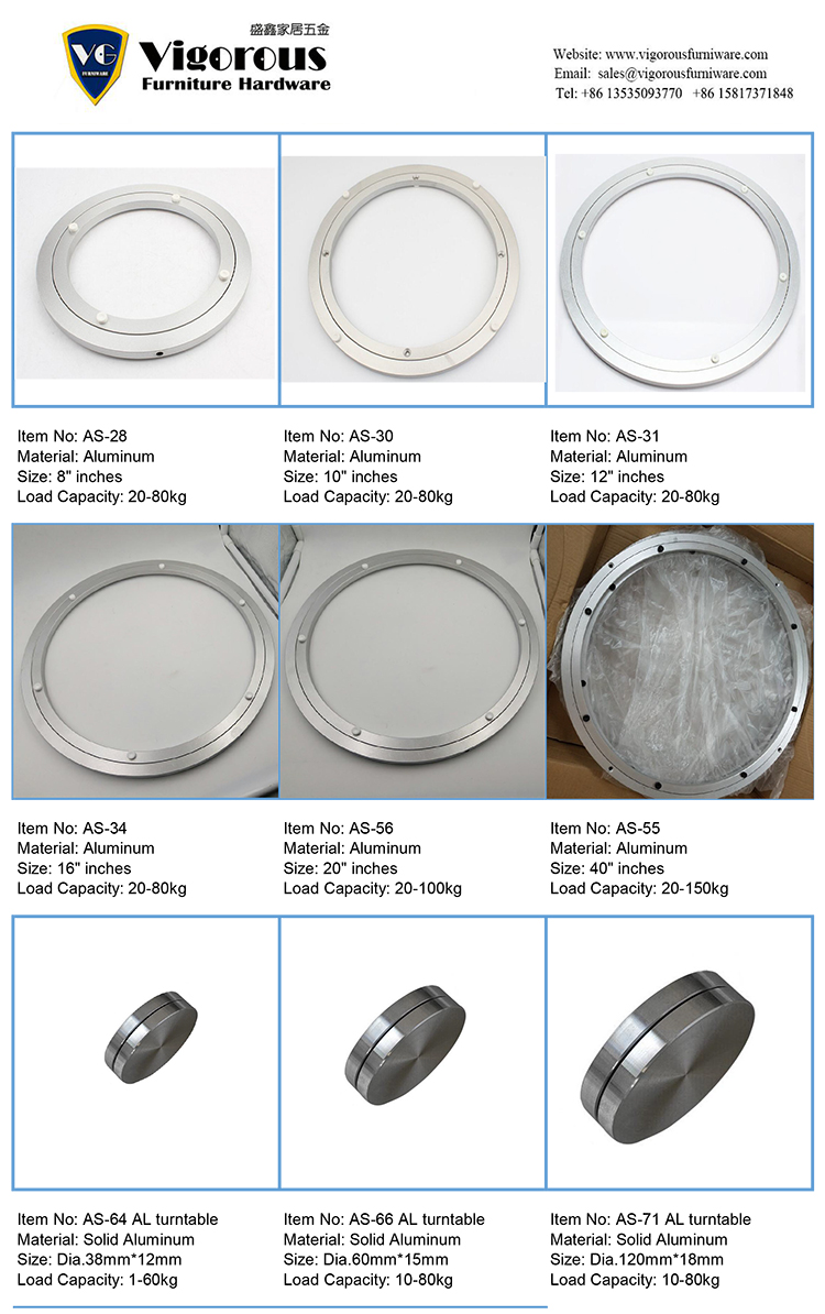 brand: KONLON and OEM color: silver port: Shanghai payment terms: L/C, Western Union, D/P, D/A, T/T, MoneyGram Package preview: Material: aluminum sample: usable Supply capacity: 50000 pieces per month MOQ: 1 item model: 14" turntable bearing lazy susan type: turntable feature: 360 degree rotation..... -