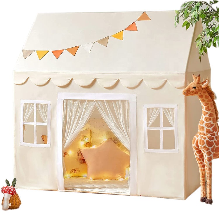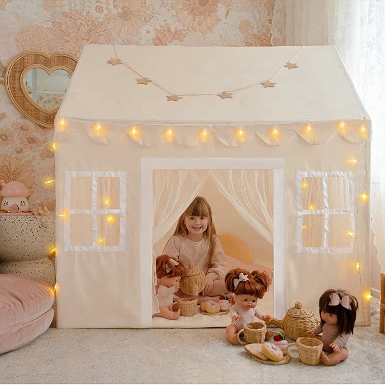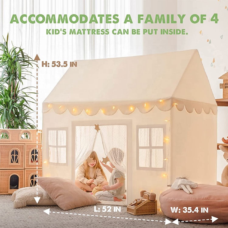 Play Tent with Cushion and LED Lights, Kids Tent, Kids Playroom, Toddler Indoor Bed Tent, Toys for Girls 3, 4, 5, 6 Years Old, Neutral Colors Playroom Furniture