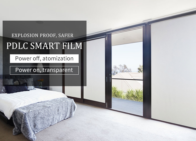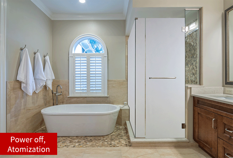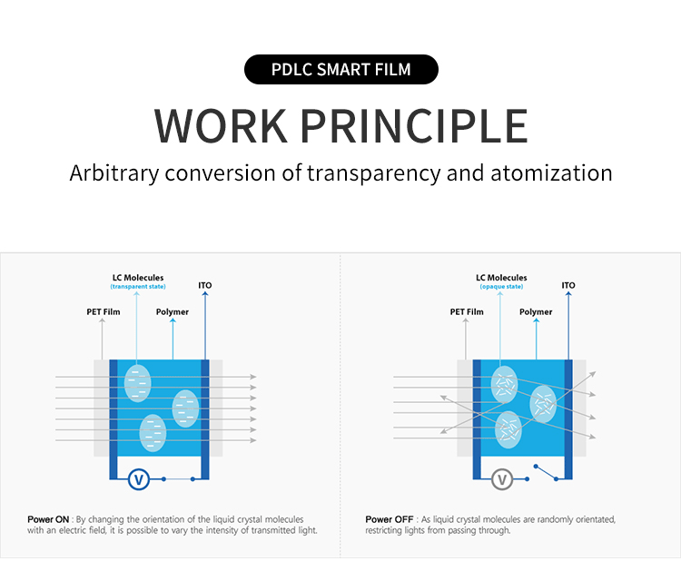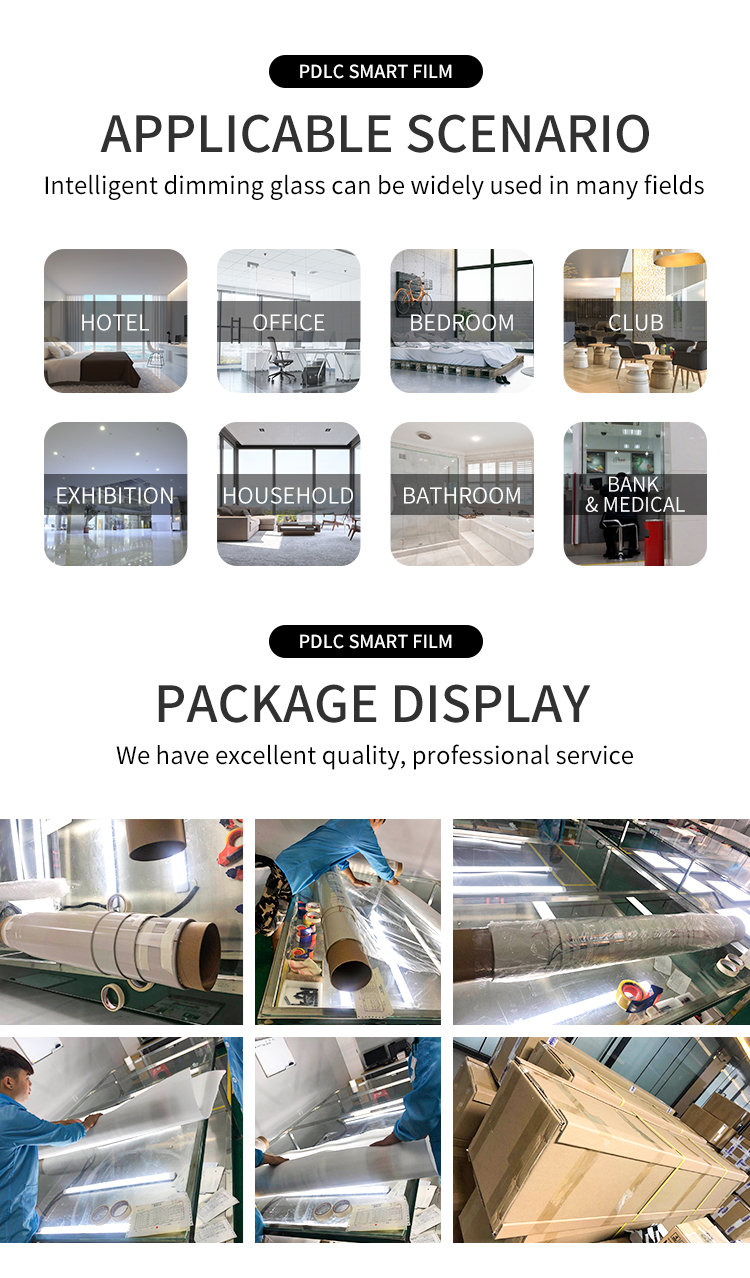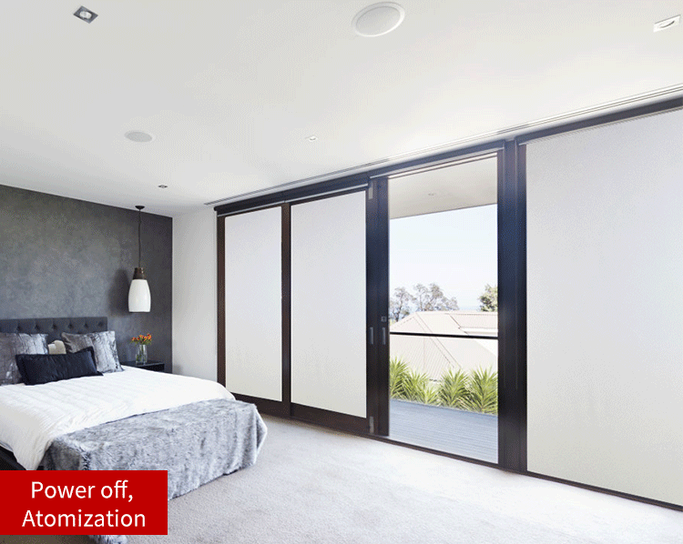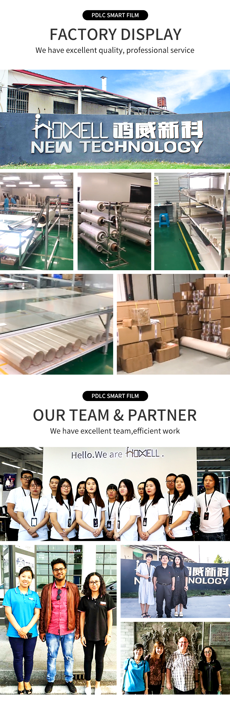 In the "off state," when no power is applied to the smart film, light is absorbed or scattered, and the film appears dark gray or white. In the "on state," light is transmitted through and the film appears transparent. And we can provide installation video!