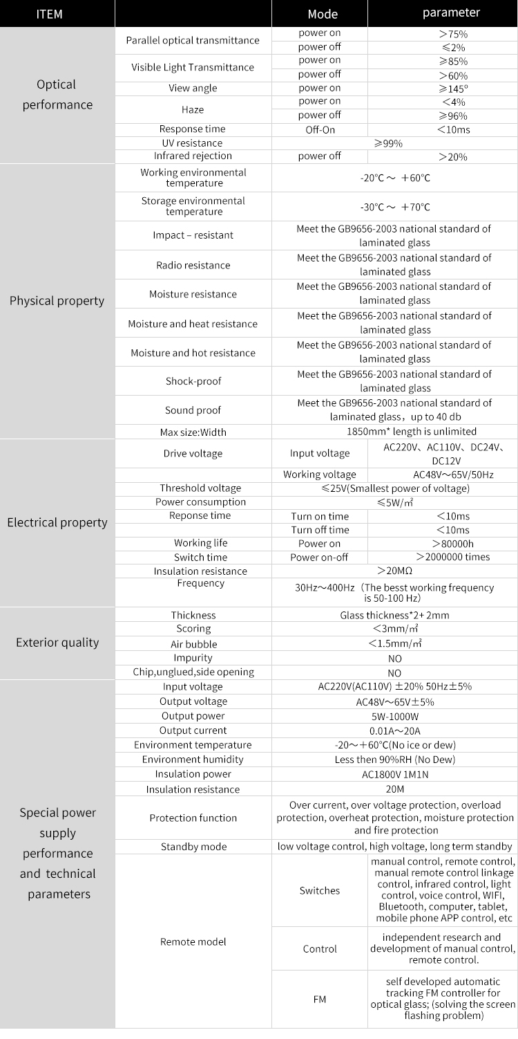 Glass thickness+0.76mm(EVA)+0.44mm PDLC film+0.76mm(EVA)+glass thickness(glass thickness: 3mm-20mm)