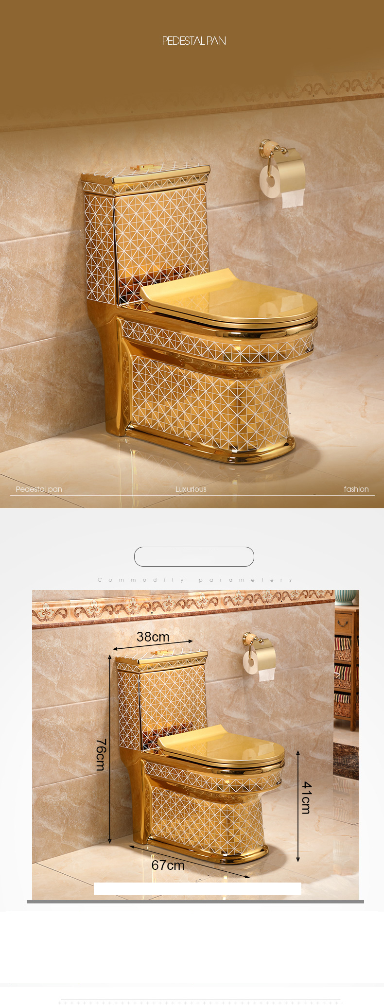 size: 675x340x820mm Supply capacity: 8000 pieces per month payment terms: L/C, D/A, D/P, T/T, Western Union port: Shenzhen/Shantou/Foshan/Guangzhou structure: piece Material: ceramics Install: Floor type Washing method: gravity flush color: the gold product name: Golden Throne Toilet style: Modern..... -