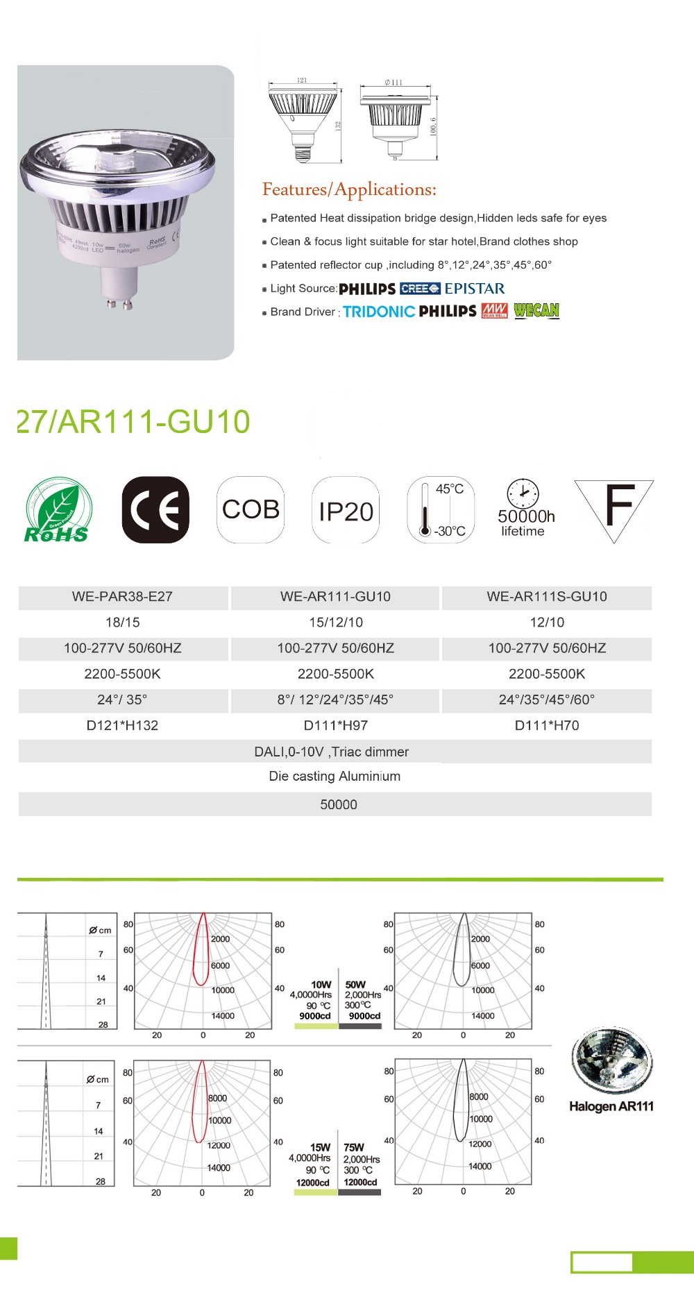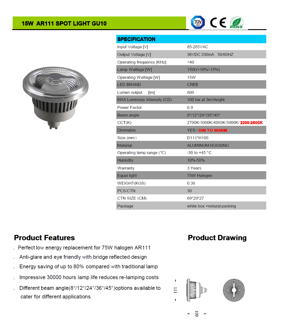 Newest Dimmable AR111 LED Bulb 15w GU10 LED AR111 ES111 LED Spotlight AC85-265V