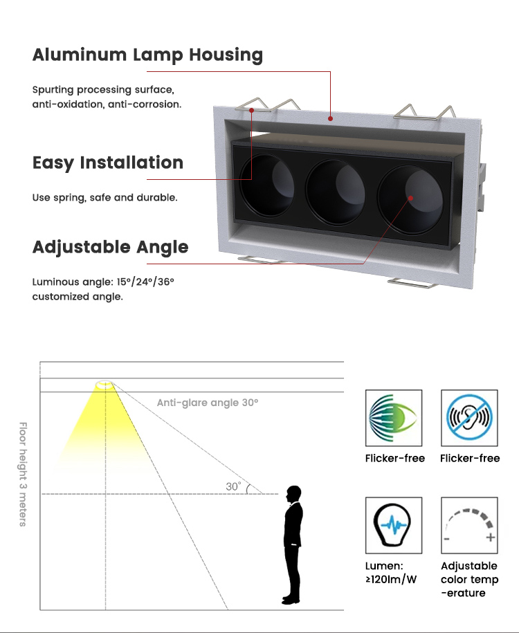 Support dimmer: Yes Input voltage (V): AC 200-240V Lighting Solutions Services: Lighting and circuit design, automatic CAD layout, on-site measurement, engineering installation Lamp luminous efficiency (lm/w): 80 Key words: Anti-glare Working hours (hours): 30000 Item type: grille light port:...... -