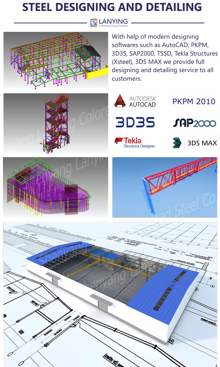 By using AutoCAD, PKPM, MTS, 3D3S, Tarch, Tekla Structures (Xsteel), etc., we can design complex industrial buildings such as office buildings, supermarkets, car dealerships, shipping shopping malls, five-star hotels.