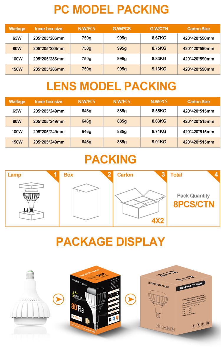| according to: | E40 E39 E27 | Packaging details: | Color box packaging: 8 pieces per box |