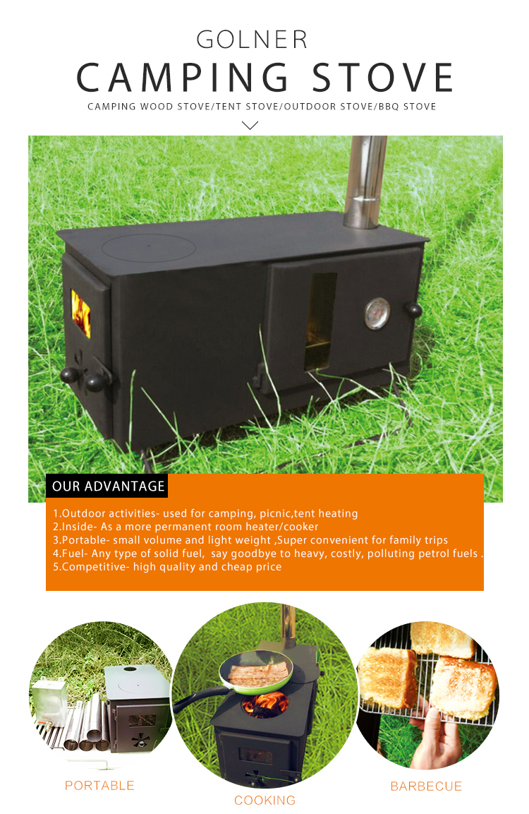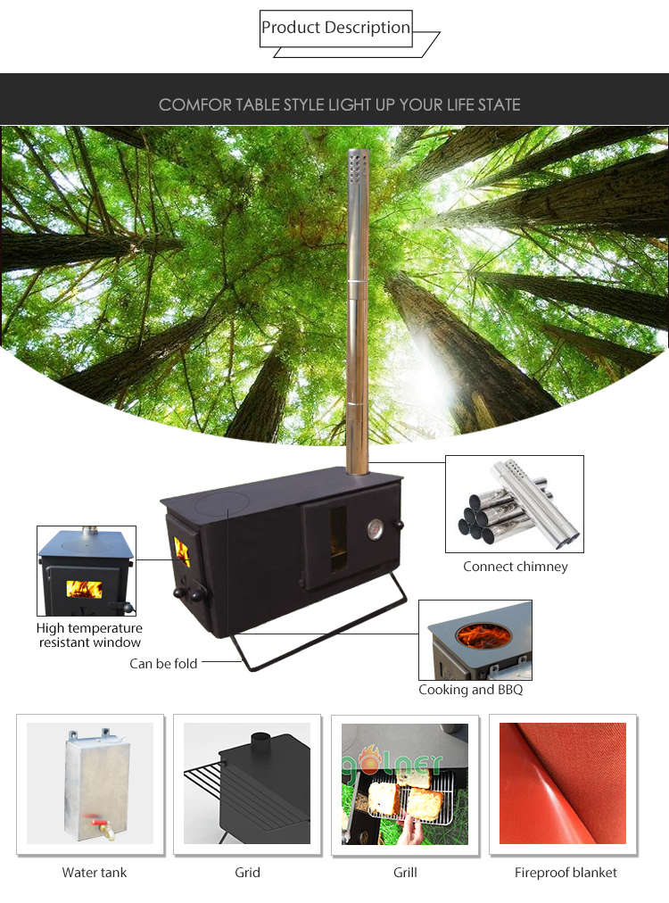 This is a very exquisite camping tent stove that is foldable, small and easy to carry. Warming, boiler water, cooking, barbecue.