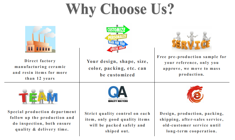 Xiamen Jinshengyang Industrial Co., Ltd. is a direct sales factory that has been producing ceramic and resin products for many years. Our factory is located in Dehua Town, China, covering an area of 8000 square meters.