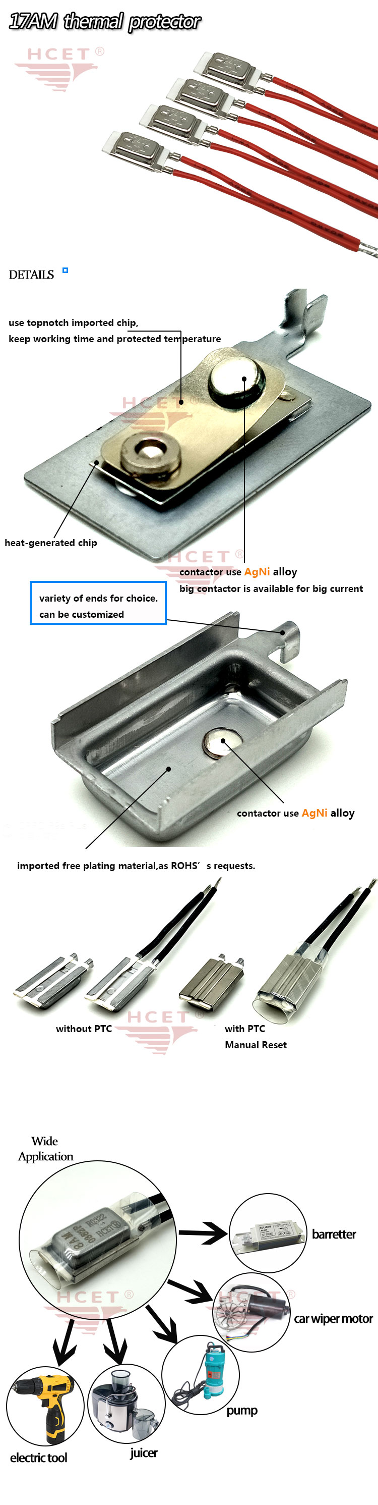 We are an engineering and manufacturing factory specializing in the production of high quality motor protectors, overload current protectors, thermal protectors, thermal cut-off switches, temperature switches, thermal circuit breakers and thermostats. The products have passed ISO/TS 16949, UL and CQC certificates. Our products are widely used in glass lift motors, wiper motors, juicers, blenders, small tubular motors, power tools, batteries, transformers... We have experienced engineers to develop products for customers, and we have the HCET brand .
