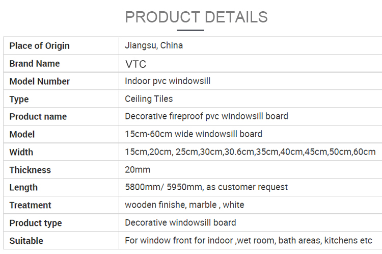 thickness: 20mm Sales unit: single product treat: wood veneer, marble, white Origin: Jiangsu, China After-sales service: Online technical support, return and exchange model: Indoor pvc window sill panels, decorative fireproof pvc window sill panels suitable: Window fronts in interiors, wet rooms,...... -