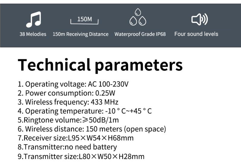 payment terms: L/C, Western Union, D/P, D/A, T/T, MoneyGram Button Size: 85*53*24mm Packaging Details: cardboard box brand: matruel melody: 19 pieces of music distance: 150 meters (open distance) Energy source: Battery Origin: Guangdong, China Warranty: 2 years Wireless network type: 2.4GHz...... -