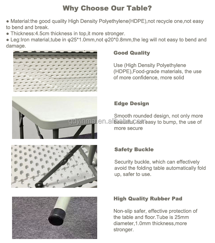 General use: outdoor furniture Top material: High Density Polyethylene (HDPE) structure: folding structure Origin: Zhejiang, China Warranty: 1 year design style: modern specific purpose: outdoor table Packaging Details: Inner packing: 1 pcs per polybag Outer packing: 50 pcs per brown carton Mail...... -